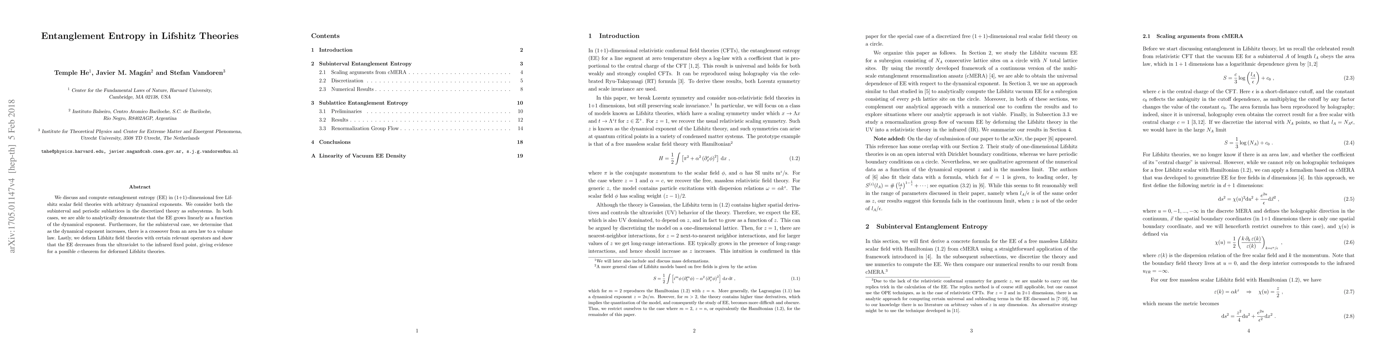 This paper computes entanglement entropy in (1+1)-dimensional free Lifshitz scalar field theories, showing a linear growth with the dynamical exponent and a crossover from area to volume law for subintervals. It also demonstrates a decrease in entanglement entropy from ultraviolet to infrared fixed points in deformed Lifshitz theories.