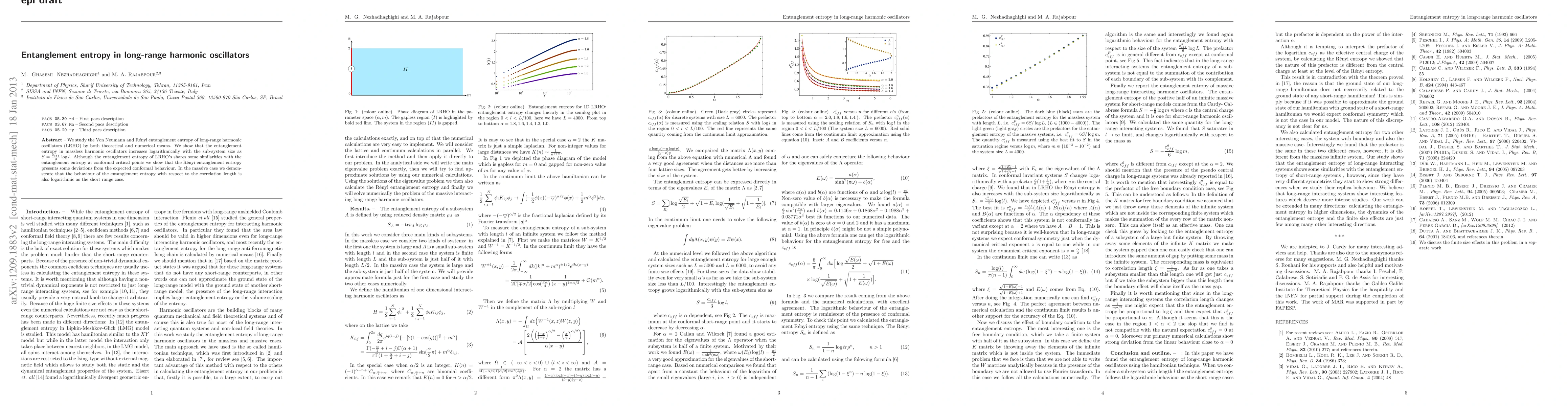 This paper investigates the entanglement entropy in long-range harmonic oscillators, finding logarithmic growth with subsystem size in both massless and massive cases. While similarities to conformal critical points exist, the Rényi entanglement entropy shows deviations from expected conformal behavior.