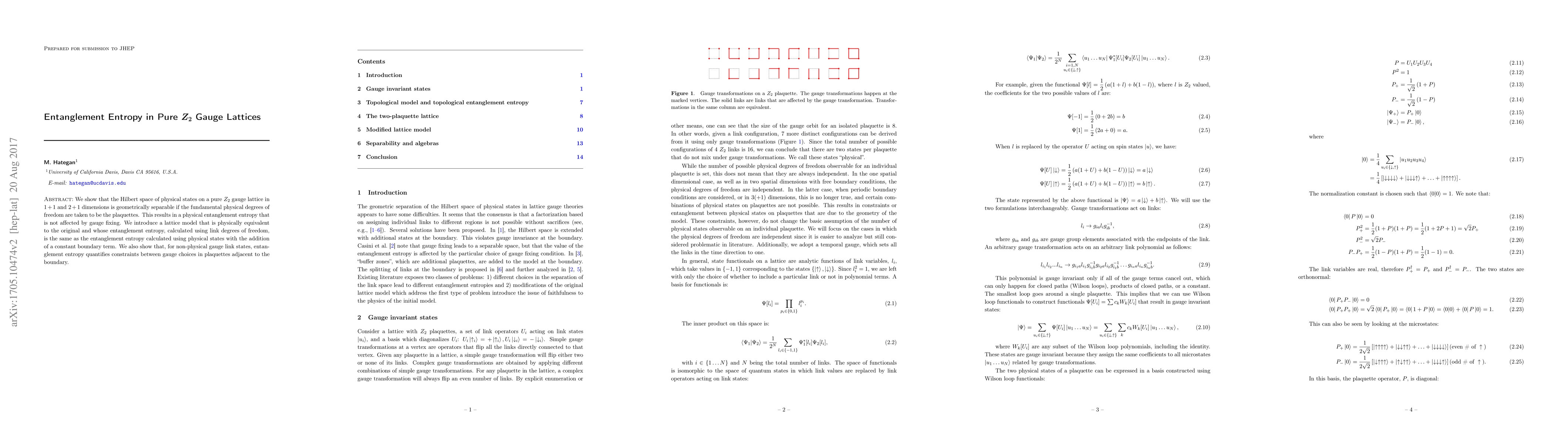 This paper demonstrates that the Hilbert space of physical states on a pure $Z_2$ gauge lattice is geometrically separable, leading to entanglement entropy unaffected by gauge fixing. It introduces a lattice model equivalent to the original, showing that entanglement entropy calculated using link degrees of freedom matches that from physical states, and highlights how entanglement entropy quantifies constraints between gauge choices near boundaries.