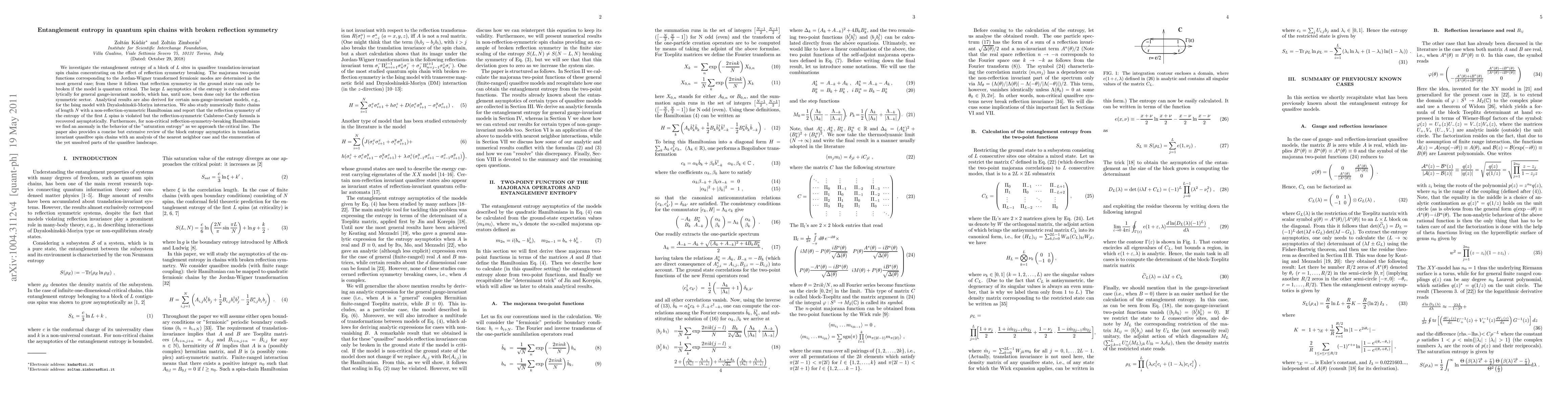 This paper investigates the entanglement entropy in quantum spin chains with broken reflection symmetry, determining the conditions under which such symmetry can be broken and calculating the large L asymptotics of the entropy. It finds that reflection symmetry breaking occurs only at quantum criticality and provides analytical and numerical results for both gauge-invariant and non-gauge-invariant models.