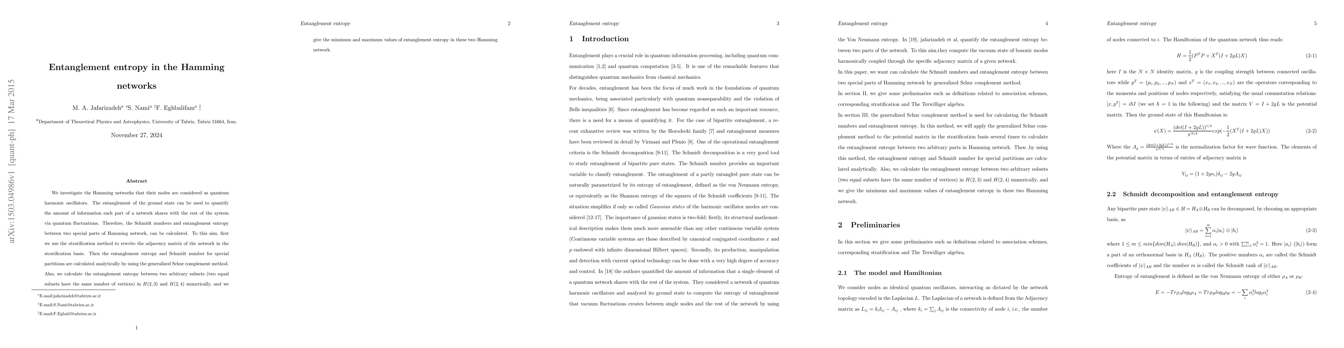 The paper presents a detailed method for calculating entanglement entropy in Hamming networks using the stratification and generalized Schur complement methods.