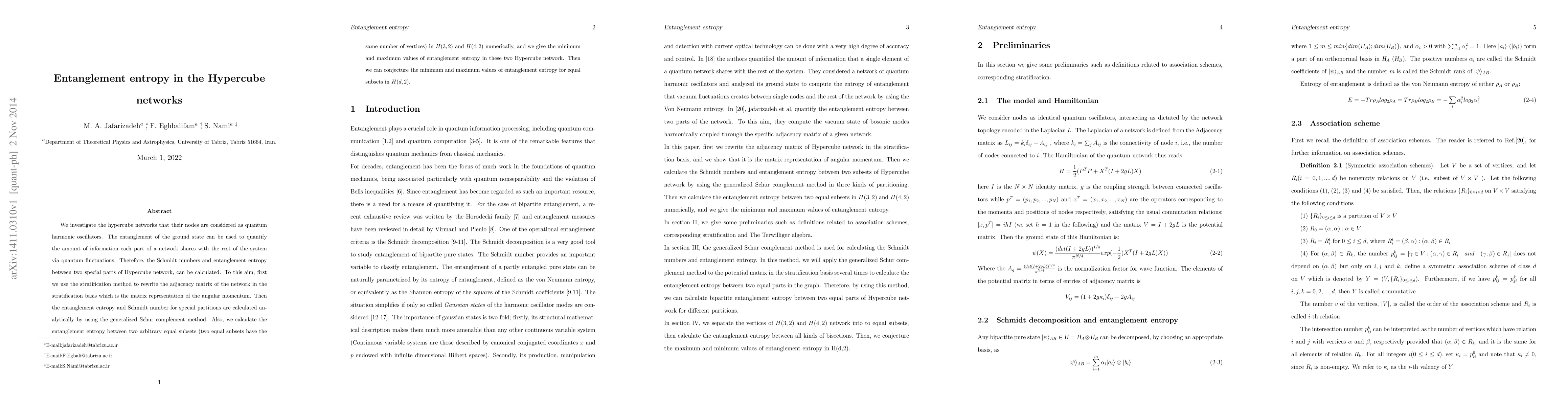 This paper studies entanglement entropy in hypercube networks modeled as quantum harmonic oscillators, using the stratification method and generalized Schur complement to calculate Schmidt numbers and entanglement entropy analytically. Numerical calculations for H(3, 2) and H(4, 2) provide minimum and maximum entanglement entropy values, leading to conjectures for equal subsets in larger hypercubes.