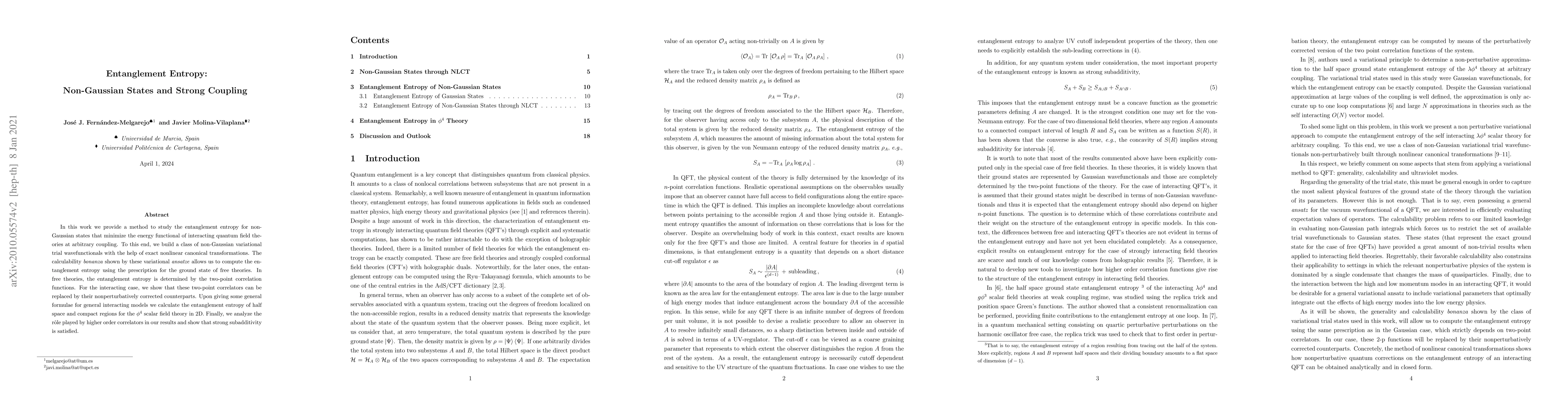 Researchers developed a method to calculate entanglement entropy for non-Gaussian states in quantum field theories at strong coupling, enabling accurate results through nonlinear canonical transformations and corrected two-point correlators.