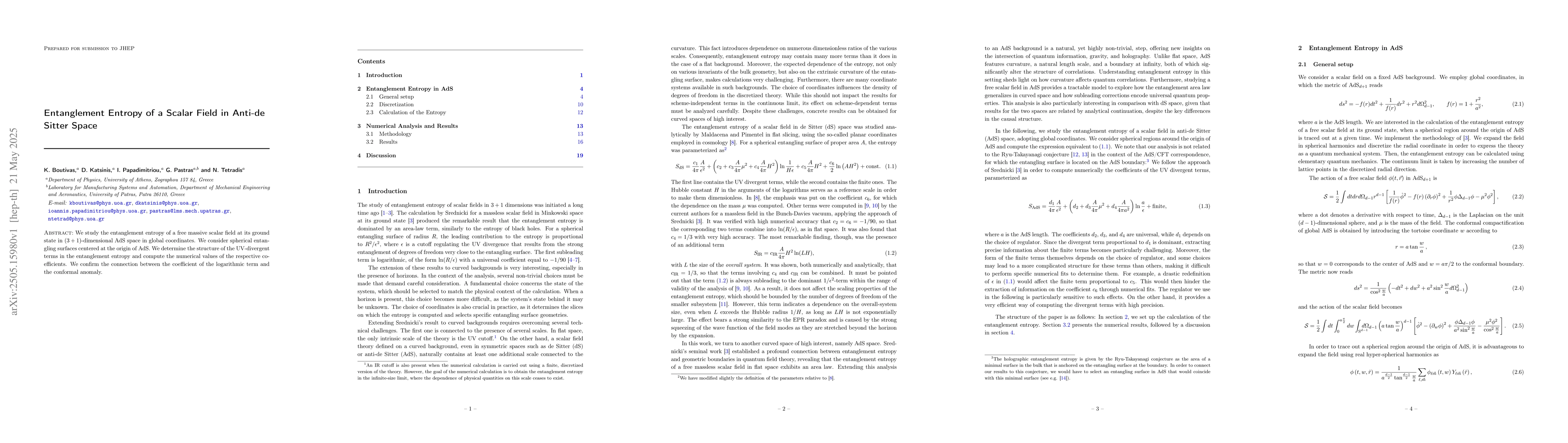 This research paper calculates the entanglement entropy of a free massive scalar field in anti-de Sitter space, determining its UV-divergent terms and connecting them to conformal anomalies.