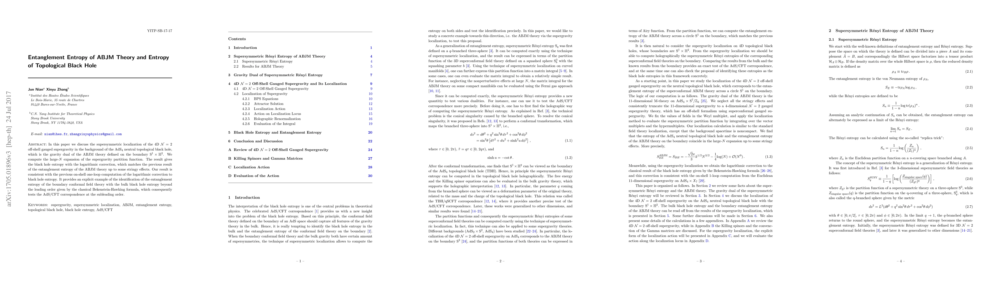 This paper computes the entanglement entropy of the ABJM theory via the supersymmetric localization of 4D $\mathcal{N}=2$ gauged supergravity in the context of an $\textrm{AdS}_4$ neutral topological black hole, showing a logarithmic correction to the black hole entropy that matches the ABJM entanglement entropy up to stringy effects, thus testing the AdS/CFT correspondence at subleading order.
