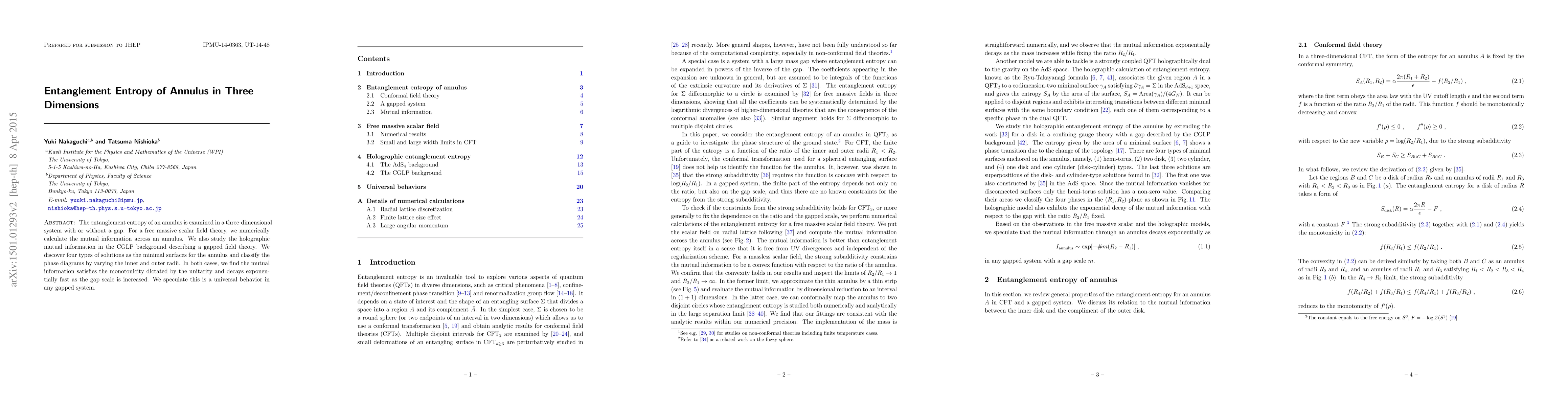 This paper numerically investigates the entanglement entropy of an annulus in a three-dimensional system, comparing results for both gapped and gapless free massive scalar field theories. It finds that mutual information decays exponentially with increased gap scale, suggesting a universal behavior in gapped systems.