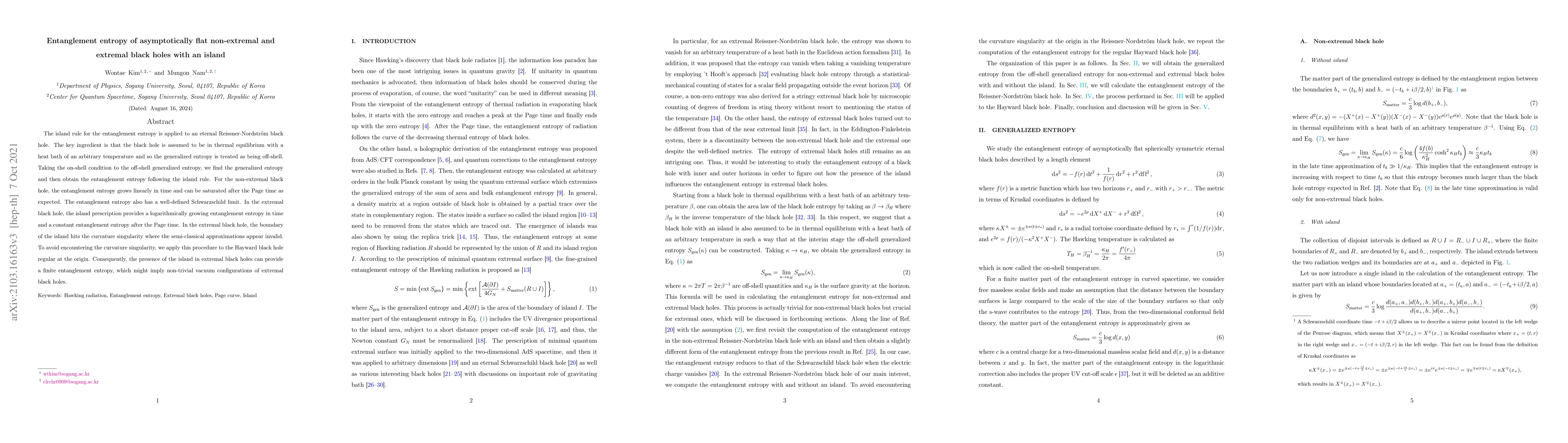 The island rule for the entanglement entropy is applied to an eternal Reissner-Nordstr\"om black hole. The key ingredient is that the black hole is assumed to be in thermal equilibrium with a heat bath of an arbitrary temperature and so the generalized entropy is treated as being off-shell. Taking the on-shell condition to the off-shell generalized entropy, we find the generalized entropy and then obtain the entanglement entropy following the island rule. For the non-extremal black hole, the entanglement entropy grows linearly in time and can be saturated after the Page time as expected. The entanglement entropy also has a well-defined Schwarzschild limit. In the extremal black hole, the island prescription provides a logarithmically growing entanglement entropy in time and a constant entanglement entropy after the Page time. In the extremal black hole, the boundary of the island hits the curvature singularity where the semi-classical approximations appear invalid. To avoid encountering the curvature singularity, we apply this procedure to the Hayward black hole regular at the origin. Consequently, the presence of the island in extremal black holes can provide a finite entanglement entropy, which might imply non-trivial vacuum configurations of extremal black holes.