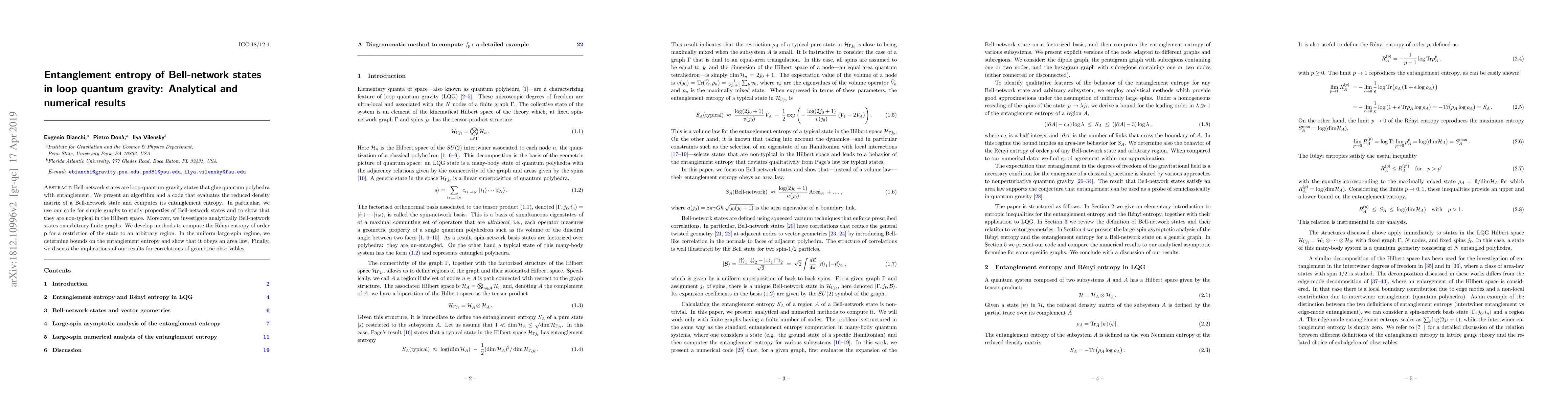 This research presents an algorithm and code to compute entanglement entropy of Bell-network states in loop quantum gravity. It reveals these states are non-typical in Hilbert space, develops methods for Rényi entropy calculation on finite graphs, and shows entanglement entropy follows an area law in the large-spin regime, with implications for geometric observable correlations.