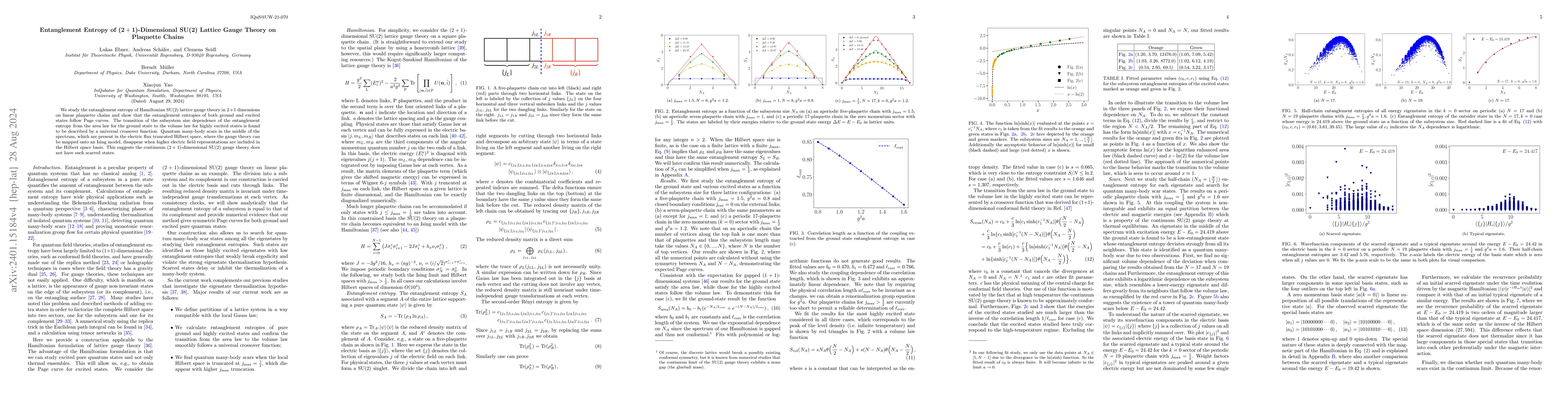 This research investigates the entanglement entropy in 2+1D SU(2) lattice gauge theory on linear plaquette chains, finding that both ground and excited states exhibit Page curve behavior. The study reveals a universal crossover from the area law to the volume law as subsystem size increases, and notes the disappearance of quantum scars in the electric flux truncated Hilbert space when higher representations are included.
