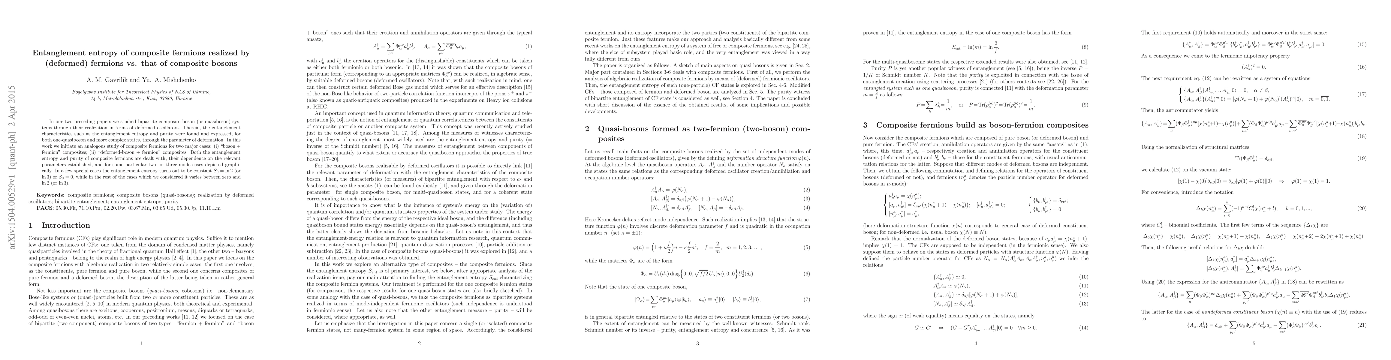 In our two preceding papers we studied bipartite composite boson (or quasiboson) systems through their realization in terms of deformed oscillators. Therein, the entanglement characteristics such as the entanglement entropy and purity were found and expressed, for both one-quasiboson and more complex states, through the parameter of deformation. In this work we initiate an analogous study of composite fermions for two major cases: (i) "boson + fermion" composites; (ii) "deformed-boson + fermion" composites. Both the entanglement entropy and purity of composite fermions are dealt with, their dependence on the relevant parameters established, and for some particular two- or three-mode cases depicted graphically. In a few special cases the entanglement entropy turns out to be constant $S_0=\ln 2$ (or $\ln 3$) or $S_0=0$, while in the rest of the cases which we considered it varies between zero and $\ln 2$ (or $\ln 3$).