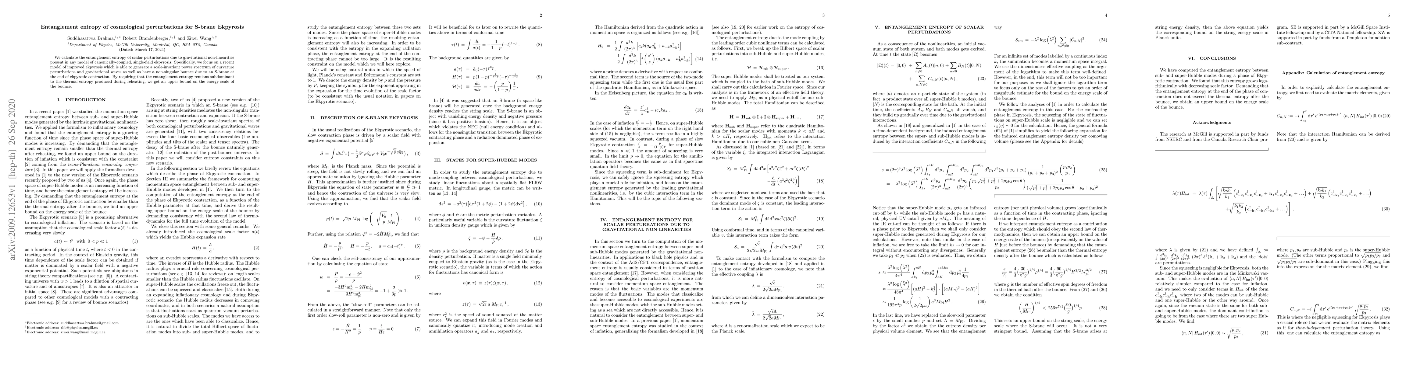 Researchers calculated the entanglement entropy of scalar perturbations in a model of ekpyrosis that includes an S-brane, finding an upper bound on energy scale for the bounce.