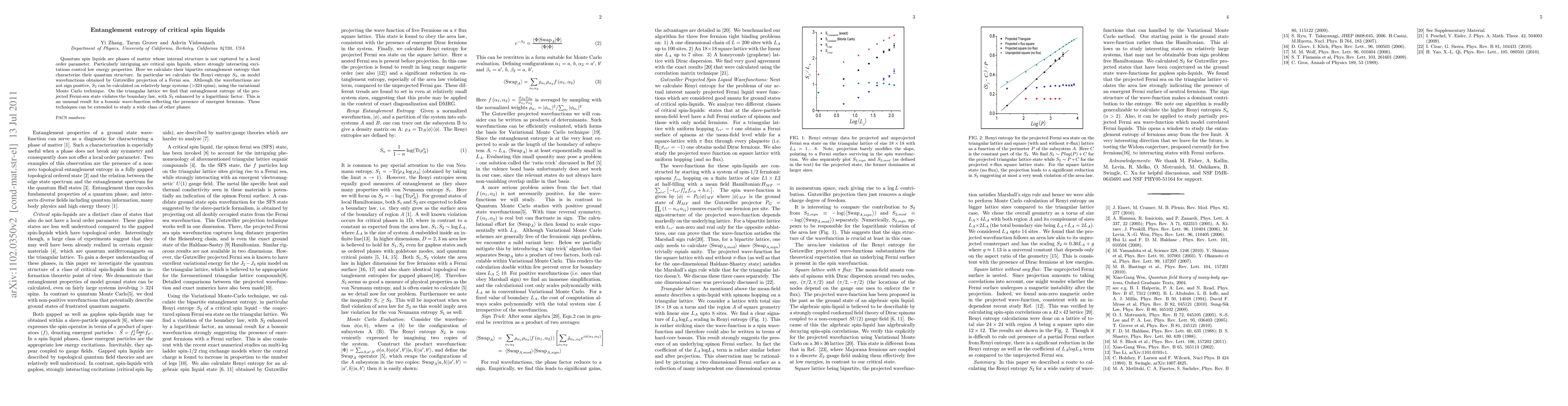 Quantum spin liquids are phases of matter whose internal structure is not captured by a local order parameter. Particularly intriguing are critical spin liquids, where strongly interacting excitations control low energy properties. Here we calculate their bipartite entanglement entropy that characterize their quantum structure. In particular we calculate the Renyi entropy $S_2$, on model wavefunctions obtained by Gutzwiller projection of a Fermi sea. Although the wavefunctions are not sign positive, $S_2$ can be calculated on relatively large systems (>324 spins), using the variational Monte Carlo technique. On the triangular lattice we find that entanglement entropy of the projected Fermi-sea state violates the boundary law, with $S_2$ enhanced by a logarithmic factor. This is an unusual result for a bosonic wave-function reflecting the presence of emergent fermions. These techniques can be extended to study a wide class of other phases.