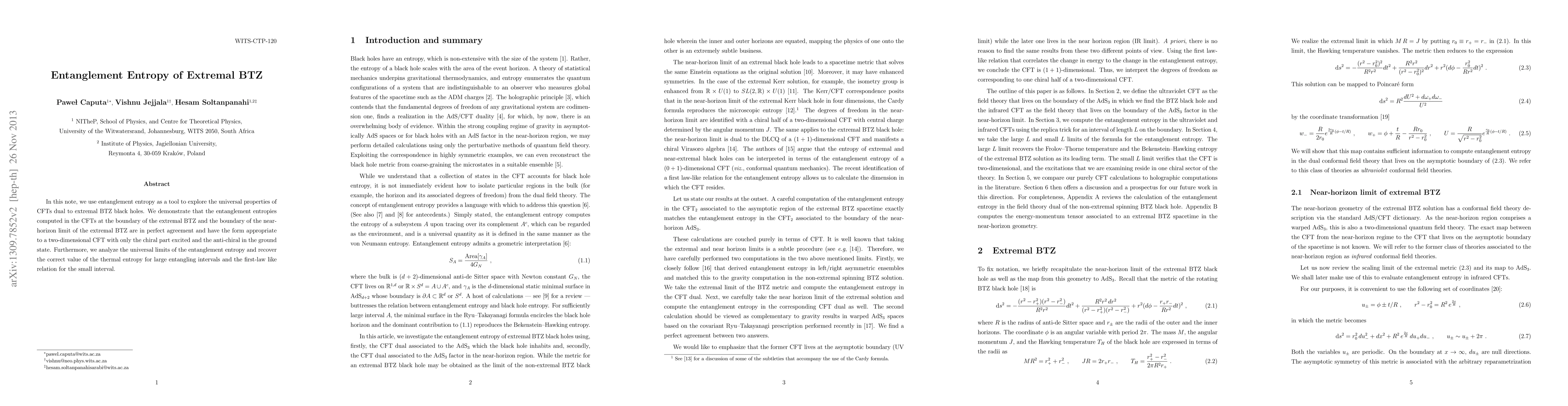 This research paper explores the entanglement entropy of extremal BTZ black holes in CFTs, finding perfect agreement between boundary and near-horizon limits with a form consistent with a 2D chiral CFT.