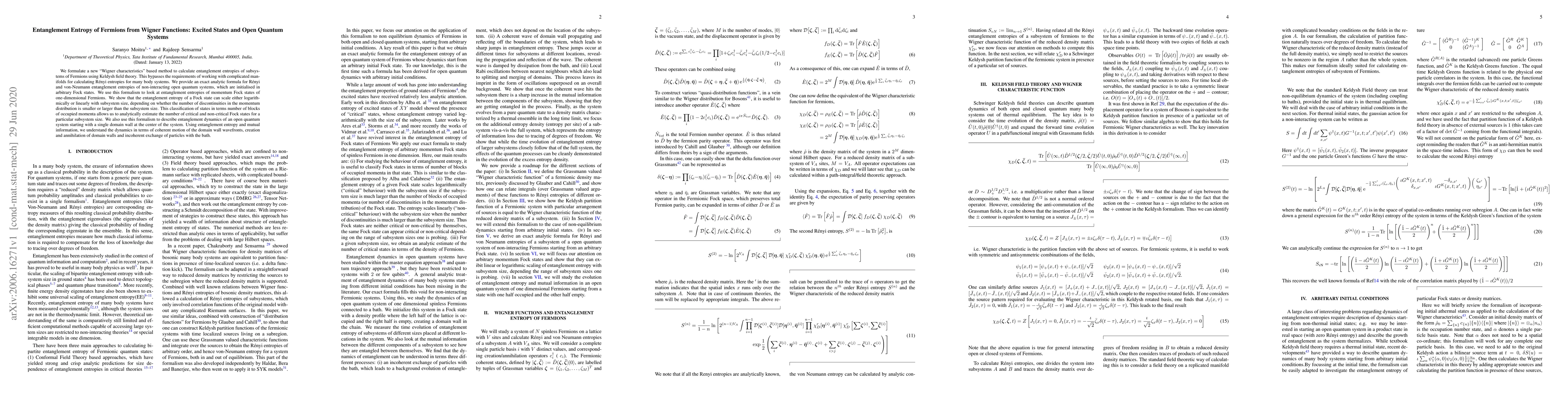 We formulate a new ``Wigner characteristics'' based method to calculate entanglement entropies of subsystems of Fermions using Keldysh field theory. This bypasses the requirements of working with complicated manifolds for calculating R\'{e}nyi entropies for many body systems. We provide an exact analytic formula for R\'{e}nyi and von-Neumann entanglement entropies of non-interacting open quantum systems, which are initialised in arbitrary Fock states. We use this formalism to look at entanglement entropies of momentum Fock states of one-dimensional Fermions. We show that the entanglement entropy of a Fock state can scale either logarithmically or linearly with subsystem size, depending on whether the number of discontinuities in the momentum distribution is smaller or larger than the subsystem size. This classification of states in terms number of blocks of occupied momenta allows us to analytically estimate the number of critical and non-critical Fock states for a particular subsystem size. We also use this formalism to describe entanglement dynamics of an open quantum system starting with a single domain wall at the center of the system. Using entanglement entropy and mutual information, we understand the dynamics in terms of coherent motion of the domain wall wavefronts, creation and annihilation of domain walls and incoherent exchange of particles with the bath.