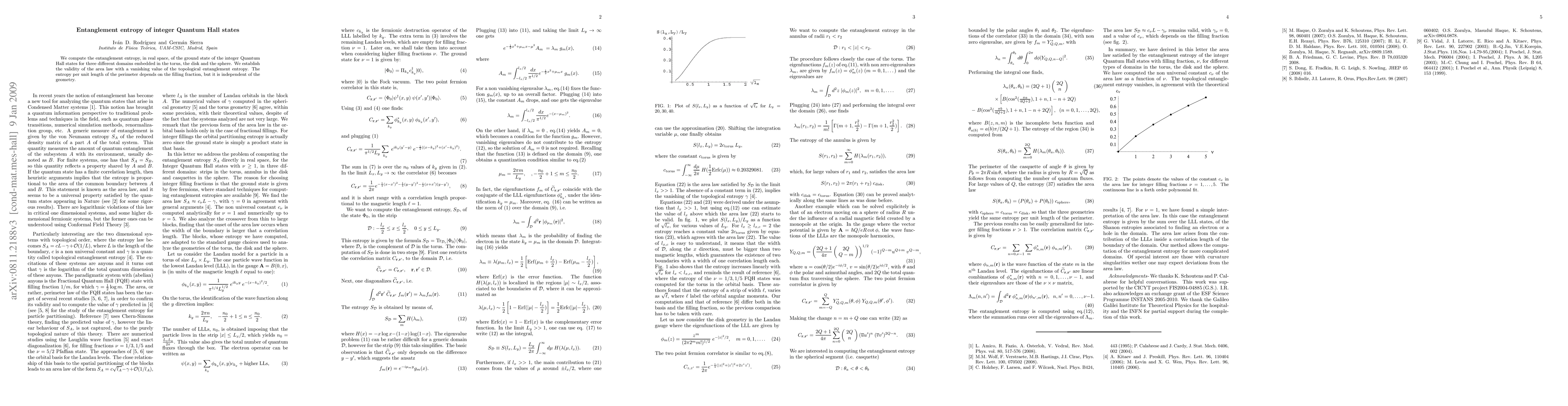 This paper computes the entanglement entropy of integer Quantum Hall states across various domains, confirming the area law with zero topological entanglement entropy. The entropy per unit length along the perimeter correlates with the filling fraction but remains geometry-independent.