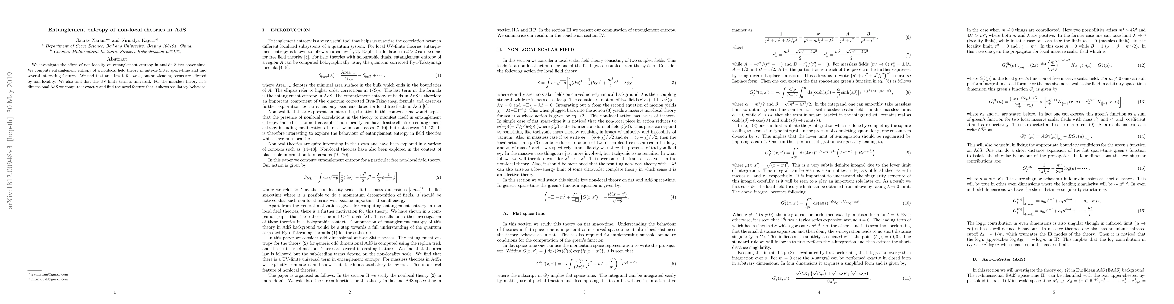 We investigate the effect of non-locality on entanglement entropy in anti-de Sitter space-time. We compute entanglement entropy of a nonlocal field theory in anti-de Sitter space-time and find several interesting features. We find that area law is followed, but sub-leading terms are affected by non-locality. We also find that the UV finite term is universal. For the massless theory in 3 dimensional AdS we compute it exactly and find the novel feature that it shows oscillatory behavior.