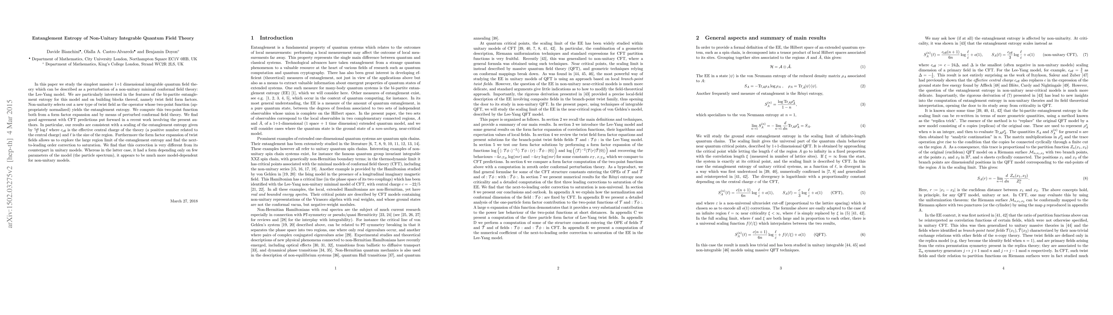 This paper investigates the entanglement entropy in a non-unitary integrable quantum field theory, specifically the Lee-Yang model, and identifies a new twist field responsible for the entanglement entropy. The results show good agreement with conformal field theory predictions and reveal a distinct next-to-leading order correction in the large region limit, differing significantly from unitary models.