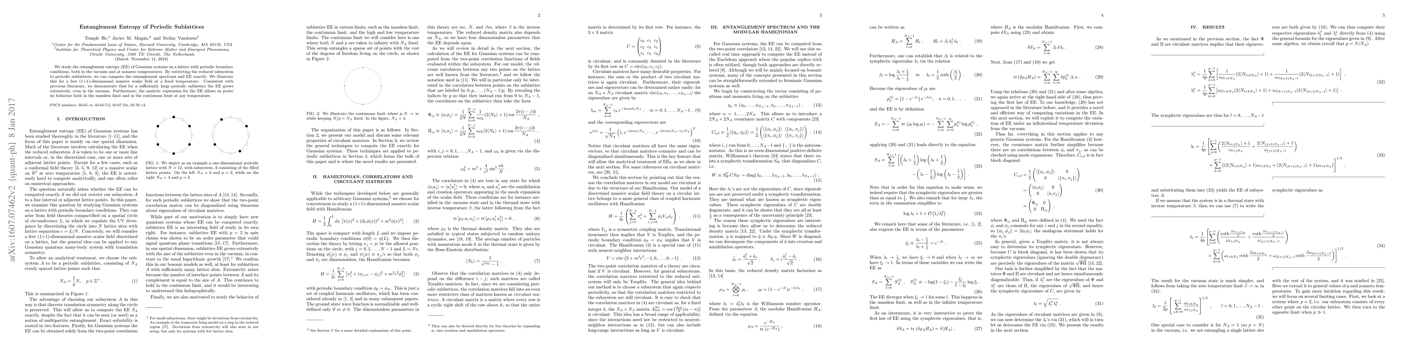 We study the entanglement entropy (EE) of Gaussian systems on a lattice with periodic boundary conditions, both in the vacuum and at nonzero temperatures. By restricting the reduced subsystem to periodic sublattices, we can compute the entanglement spectrum and EE exactly. We illustrate this for a free (1+1)-dimensional massive scalar field at a fixed temperature. Consistent with previous literature, we demonstrate that for a sufficiently large periodic sublattice the EE grows extensively, even in the vacuum. Furthermore, the analytic expression for the EE allows us probe its behavior both in the massless limit and in the continuum limit at any temperature.
