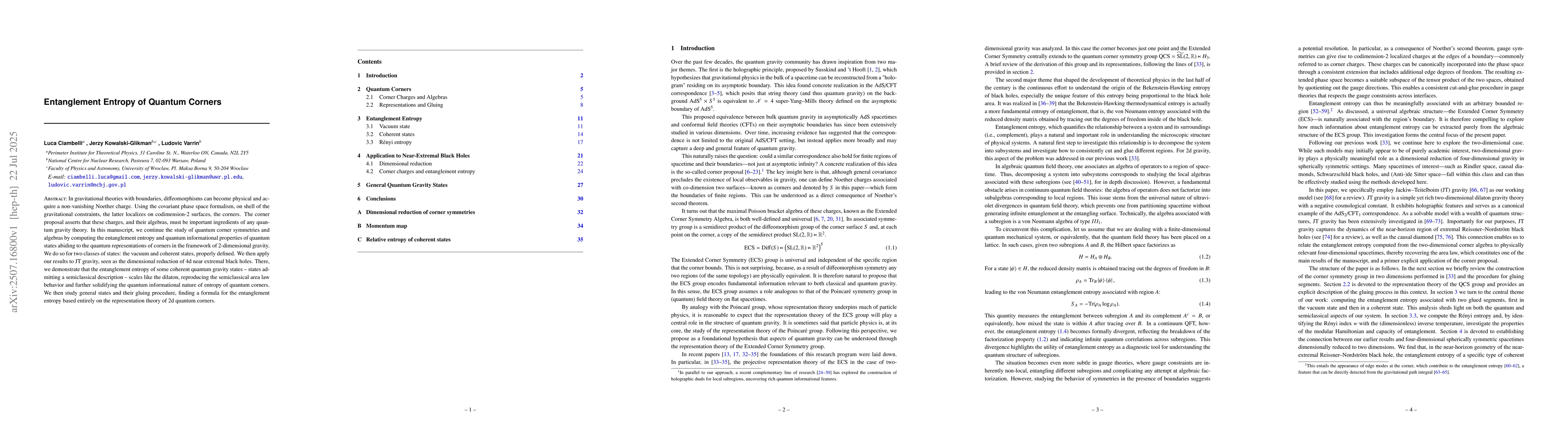 The paper presents a detailed analysis of entanglement entropy in the context of quantum corners in 2D gravity, linking it to the coalgebras of the extended cornersymmetry group and deriving explicit formulas for entanglement entropy.