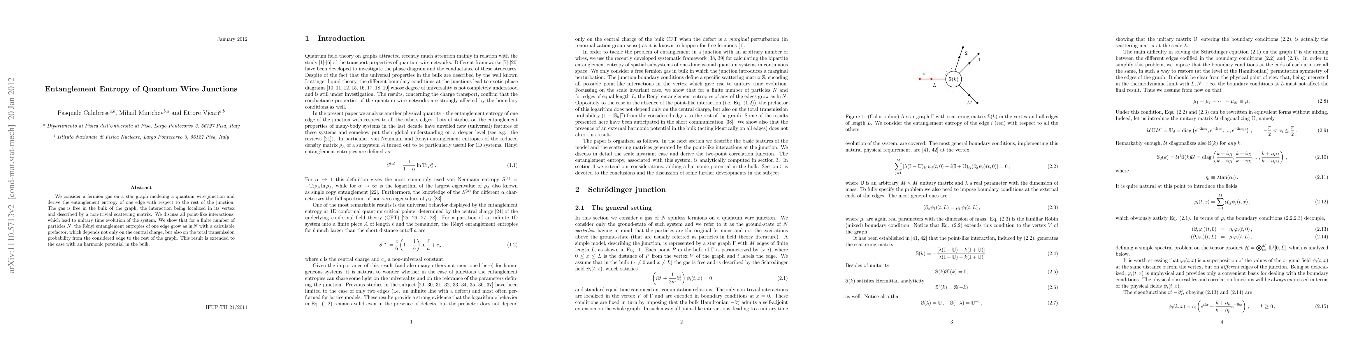 We consider a fermion gas on a star graph modeling a quantum wire junction and derive the entanglement entropy of one edge with respect to the rest of the junction. The gas is free in the bulk of the graph, the interaction being localized in its vertex and described by a non-trivial scattering matrix. We discuss all point-like interactions, which lead to unitary time evolution of the system. We show that for a finite number of particles N, the Renyi entanglement entropies of one edge grow as ln N with a calculable prefactor, which depends not only on the central charge, but also on the total transmission probability from the considered edge to the rest of the graph. This result is extended to the case with an harmonic potential in the bulk.
