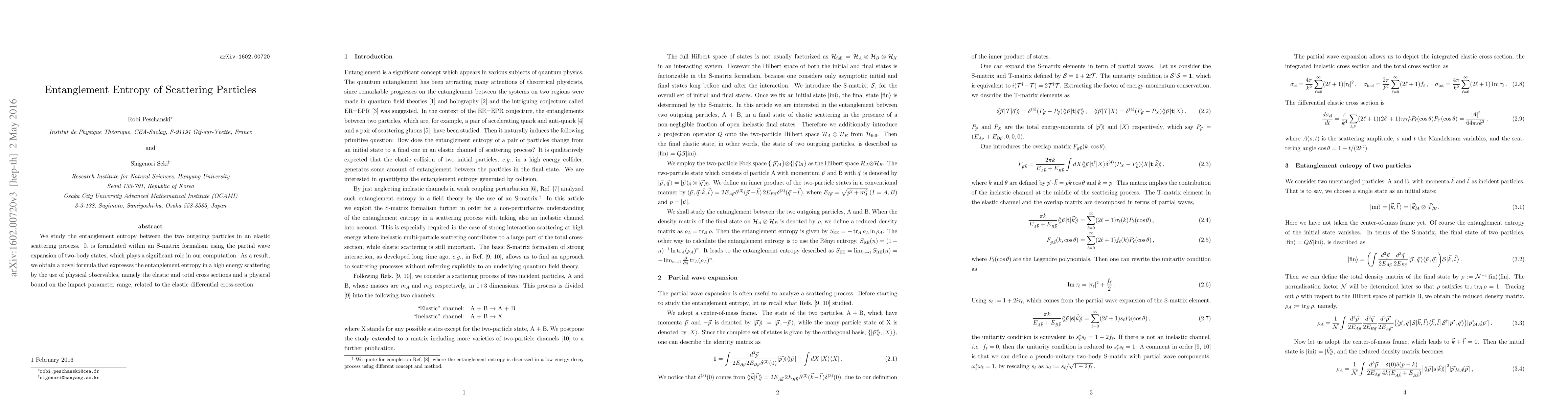 This paper formulates the entanglement entropy between two outgoing particles in elastic scattering using an S-matrix formalism and partial wave expansion. It derives a novel formula for high-energy scattering entanglement entropy based on physical observables like elastic and total cross sections and impact parameter range.