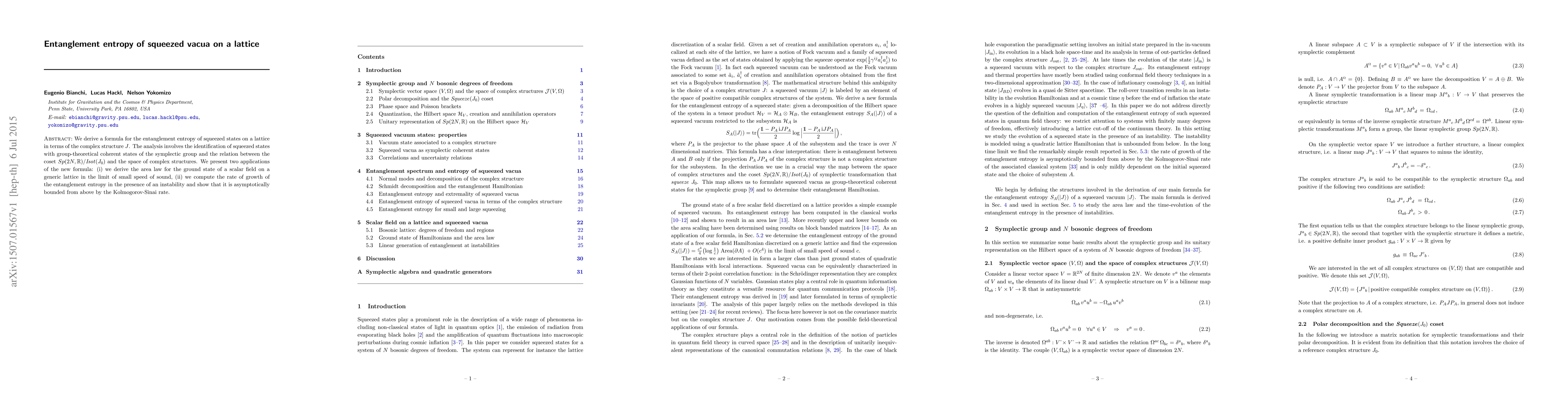 This paper derives a formula for the entanglement entropy of squeezed states on a lattice, linking them to the symplectic group's coherent states and exploring their relation to complex structures. It applies the new formula to demonstrate an area law for scalar field ground states and a bounded growth rate for entanglement entropy in unstable systems.
