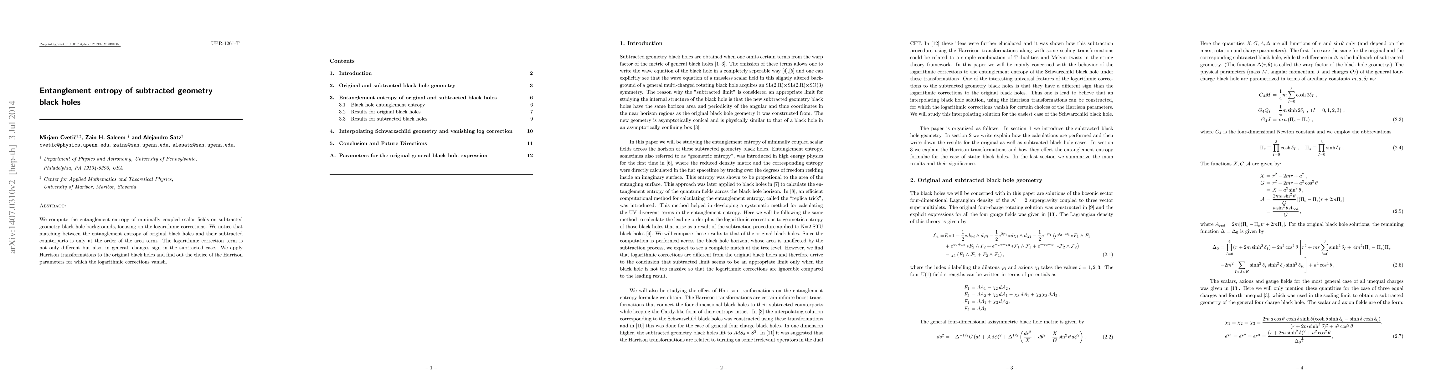 This paper investigates the entanglement entropy of scalar fields on subtracted geometry black holes, revealing that while the area term matches, the logarithmic correction differs and often changes sign. The study identifies specific Harrison parameters that eliminate these logarithmic corrections.