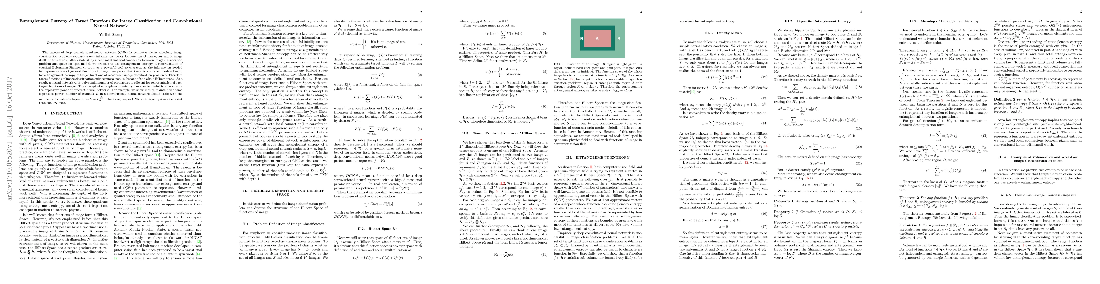 This paper proposes using entanglement entropy to analyze the information content of target functions in image classification tasks. It establishes a connection between CNNs and quantum spin models, proving that these functions occupy a small subspace in Hilbert space, allowing for efficient neural network representations with polynomial parameters.