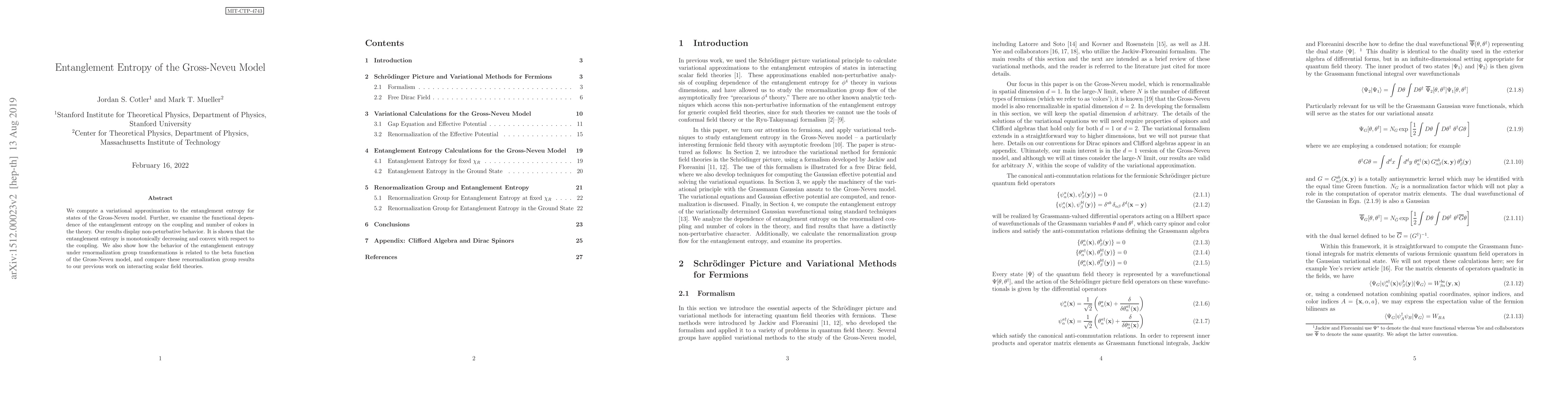 The paper presents a detailed variational calculation of entanglement entropy for the Gross-Neveu model, including renormalization group analysis and comparison with previous work on scalar field theories.