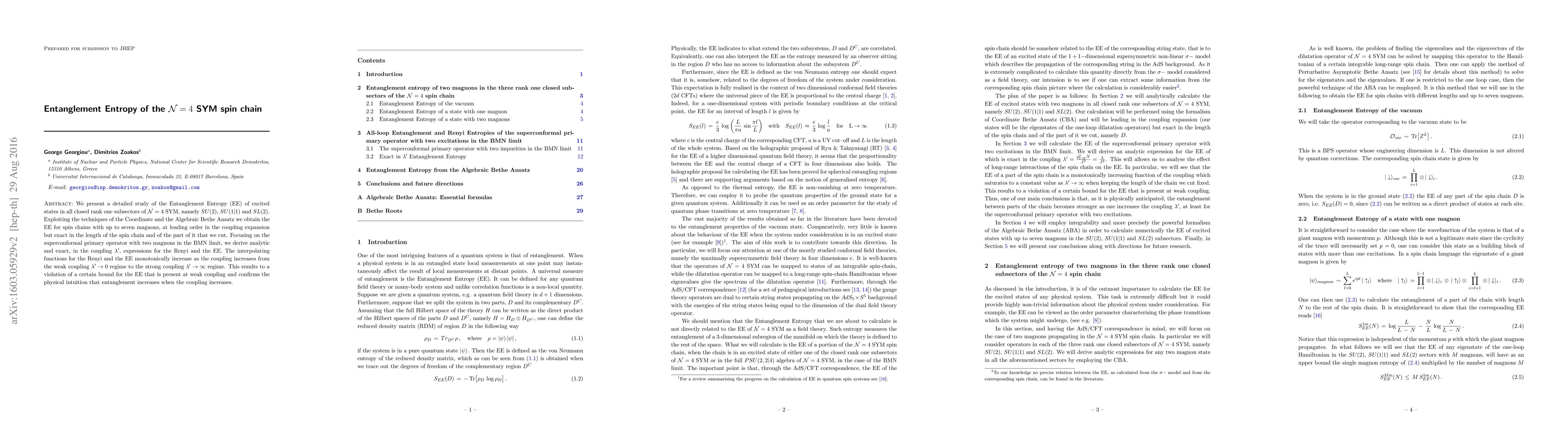 We present a detailed study of the Entanglement Entropy (EE) of excited states in all closed rank one subsectors of N=4 SYM, namely SU(2), SU(1|1) and SL(2). Exploiting the techniques of the Coordinate and the Algebraic Bethe Ansatz we obtain the EE for spin chains with up to seven magnons, at leading order in the coupling expansion but exact in the length of the spin chain and of the part of it that we cut. Focusing on the superconformal primary operator with two magnons in the BMN limit, we derive analytic and exact, in the coupling $\lambda'$, expressions for the Renyi and the EE. The interpolating functions for the Renyi and the EE monotonically increase as the coupling increases from the weak coupling $\lambda' \rightarrow 0$ regime to the strong coupling $\lambda' \rightarrow \infty$ regime. This results to a violation of a certain bound for the EE that is present at weak coupling and confirms the physical intuition that entanglement increases when the coupling increases.
