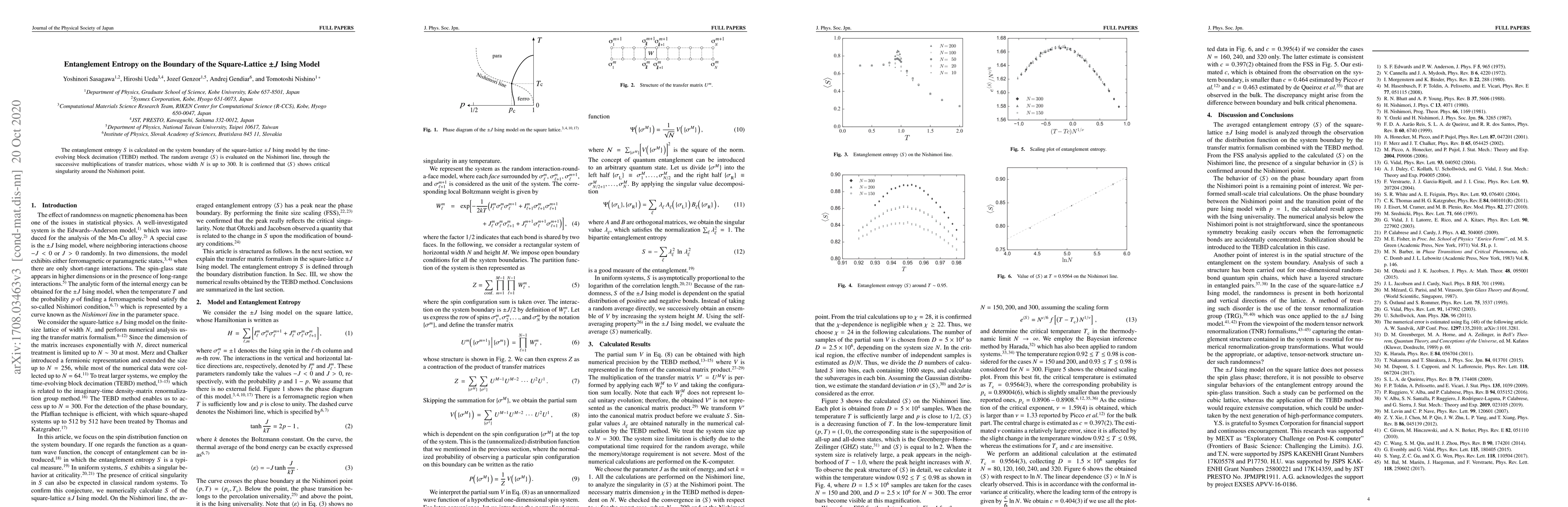 A classical analogue of the entanglement entropy is calculated on the system boundary of the two-dimensional Edwards-Anderson model, where the nearest-neighbor interaction is stochastically chosen from +J and -J. The boundary spin distribution is obtained by means of the time-evolving block decimation (TEBD) method, where the random ensemble is created from the successive multiplications of position-dependent transfer matrices, whose width is up to N = 300. The random average of the entanglement entropy is calculated on the Nishimori line, and it is confirmed that the entanglement entropy shows critical singularity at the Nishimori point. The central charge of the boundary state is estimated.