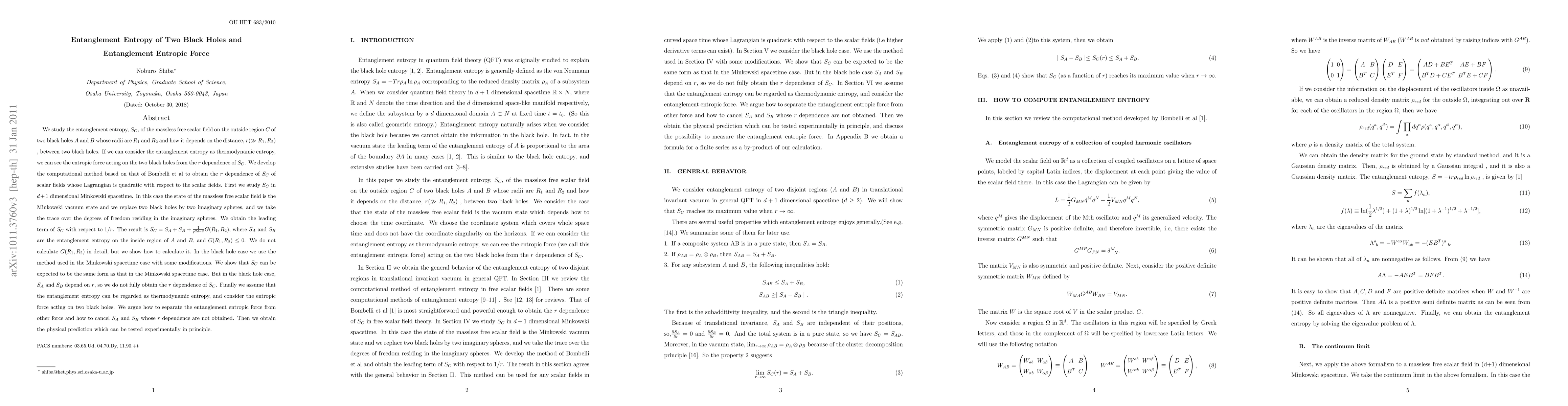This paper investigates the entanglement entropy $S_C$ of a massless free scalar field around two black holes and explores the entropic force between them. It develops a computational method to determine the $r$ dependence of $S_C$, showing that $S_C$ has a form proportional to $1/r^{2d-2}$ in both Minkowski and black hole spacetimes, with implications for the entropic force acting between the black holes.