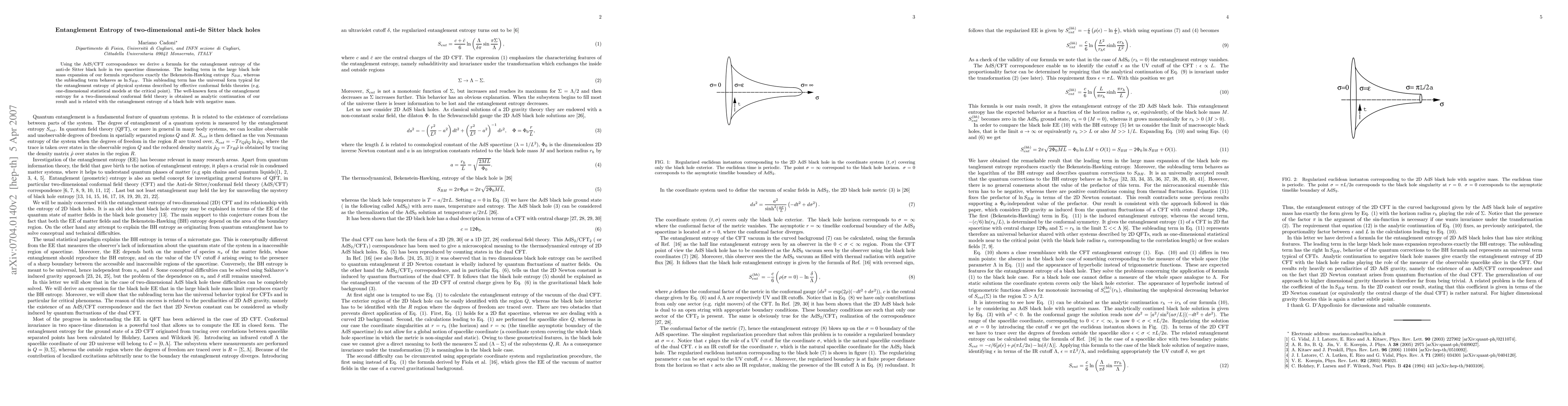 Using the AdS/CFT correspondence we derive a formula for the entanglement entropy of the anti-de Sitter black hole in two spacetime dimensions. The leading term in the large black hole mass expansion of our formula reproduces exactly the Bekenstein-Hawking entropy S_{BH}, whereas the subleading term behaves as ln S_{BH}. This subleading term has the universal form typical for the entanglement entropy of physical systems described by effective conformal fields theories (e.g. one-dimensional statistical models at the critical point). The well-known form of the entanglement entropy for a two-dimensional conformal field theory is obtained as analytic continuation of our result and is related with the entanglement entropy of a black hole with negative mass.