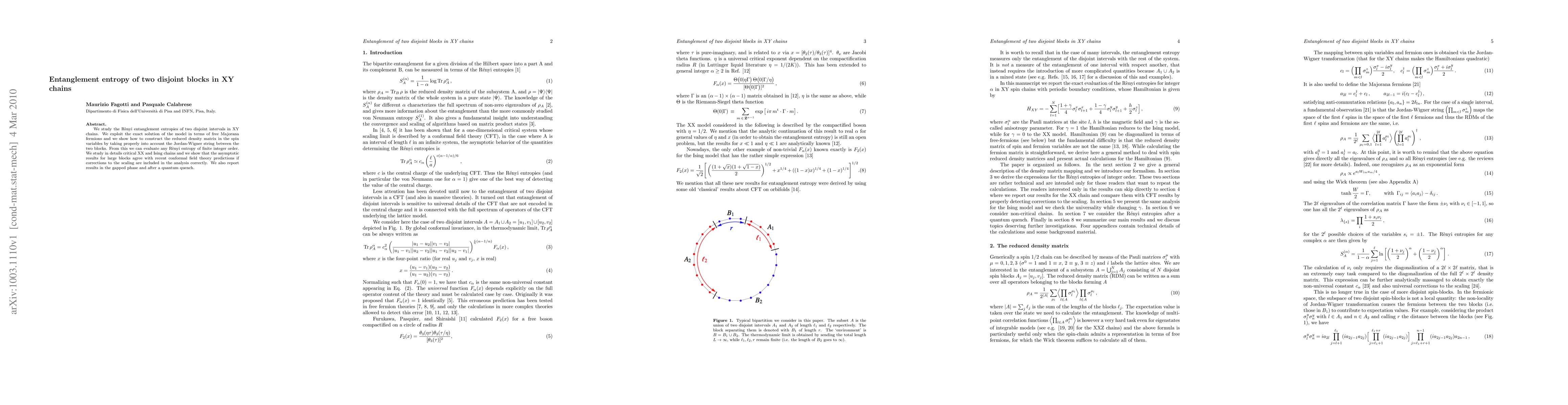 This paper investigates Renyi entanglement entropies in two disjoint intervals of XY chains using an exact solution in terms of free Majorana fermions. It constructs the reduced density matrix and evaluates Renyi entropies, showing agreement with conformal field theory predictions for critical XX and Ising chains, and reports results in the gapped phase and post-quench scenarios.