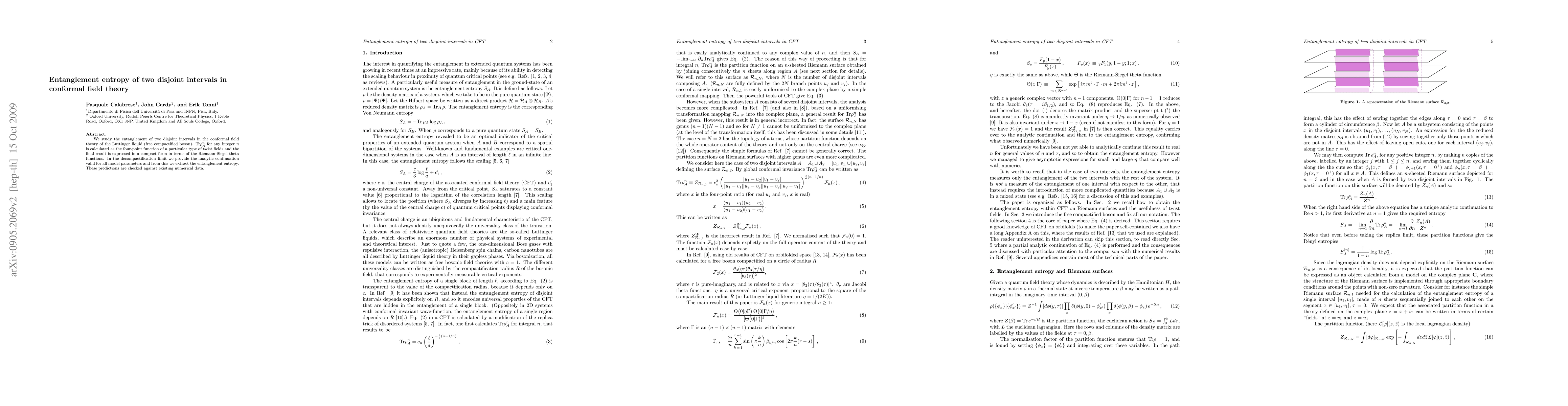 This paper calculates the entanglement entropy for two disjoint intervals in a conformal field theory of a Luttinger liquid, using the Riemann-Siegel theta functions to express the results. The study provides an analytic continuation for all model parameters and validates the predictions against numerical data.