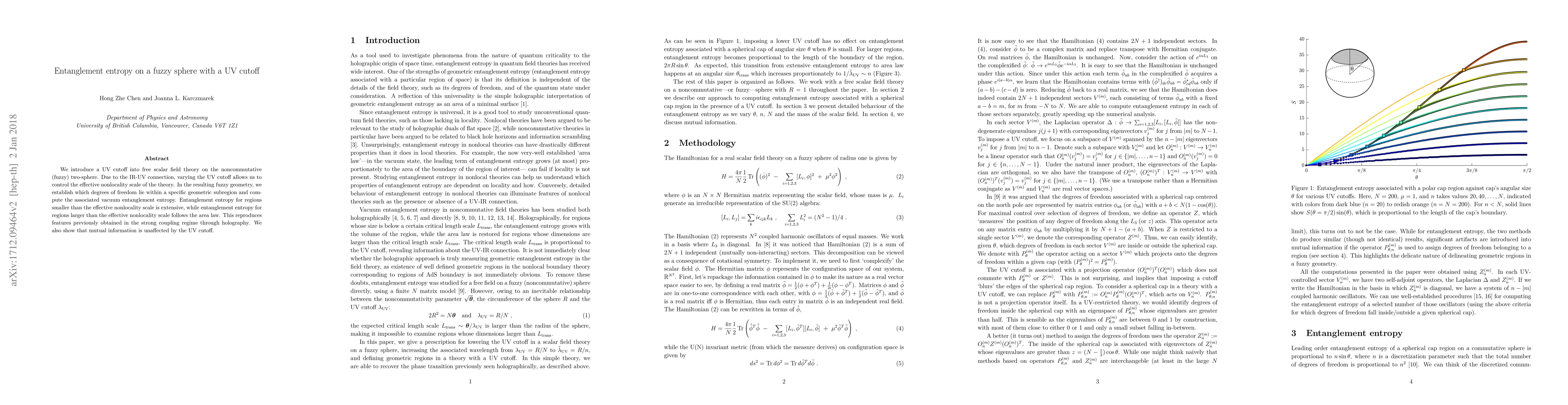 This paper investigates entanglement entropy in a free scalar field theory on a noncommutative (fuzzy) two-sphere with a UV cutoff, revealing extensive entanglement for small regions and area law for larger regions. Mutual information remains unaffected by the UV cutoff, mirroring results from holography in the strong coupling regime.