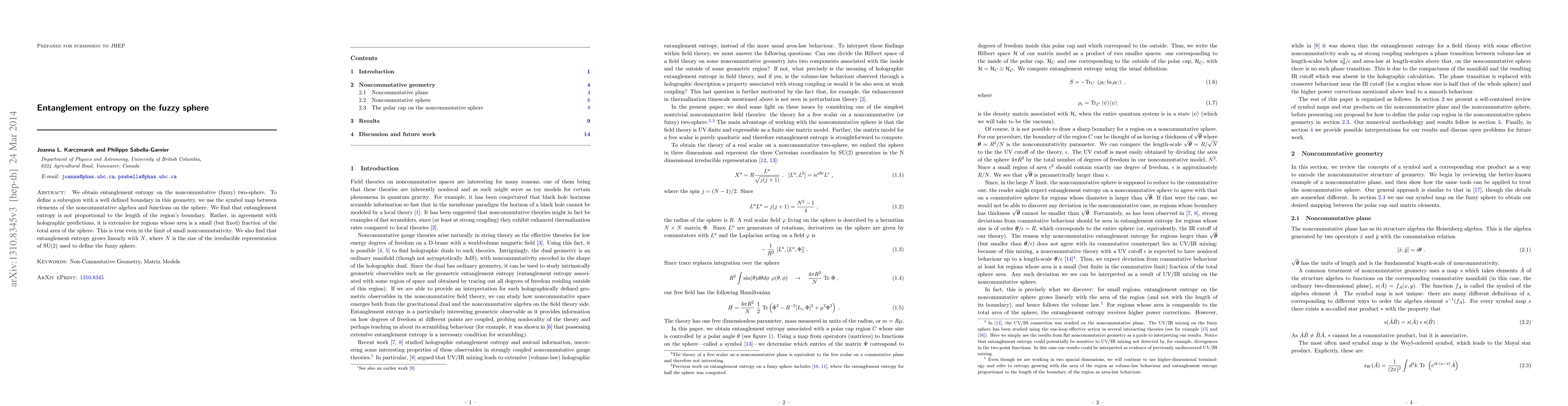Summary: This paper calculates entanglement entropy on a fuzzy two-sphere and finds it behaves extensively relative to the region's area, consistent with holographic predictions, and grows linearly with the size of the SU(2) representation used to define the sphere.