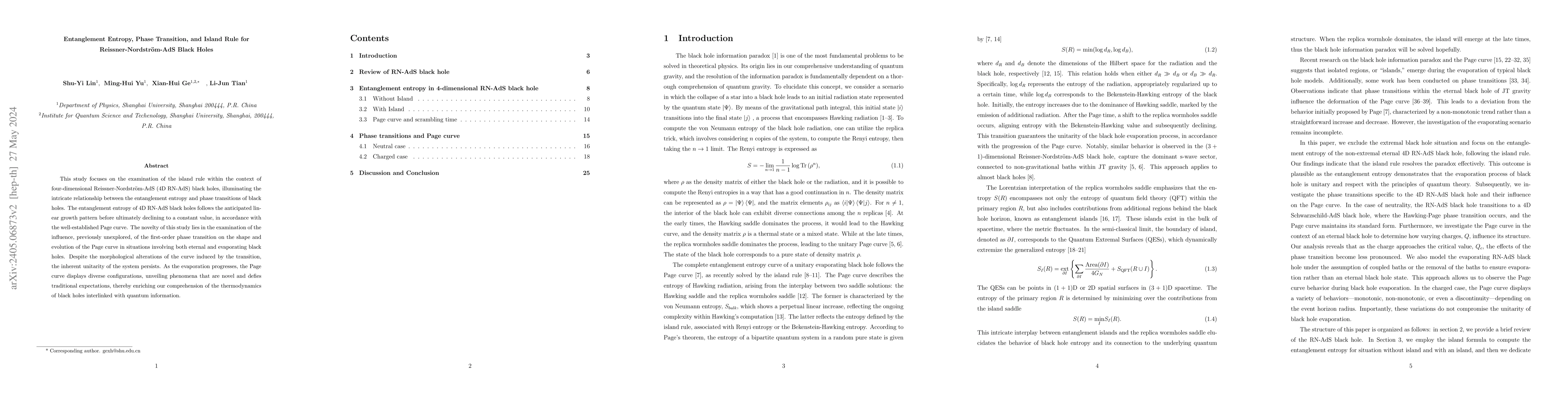 This study focuses on the examination of the island rule within the context of four-dimensional Reissner-Nordstr\"om-AdS (4D RN-AdS) black holes, illuminating the intricate relationship between the entanglement entropy and phase transitions of black holes. The entanglement entropy of 4D RN-AdS black holes follows the anticipated linear growth pattern before ultimately declining to a constant value, in accordance with the well-established Page curve. The novelty of this study lies in the examination of the influence, previously unexplored, of the first-order phase transition on the shape and evolution of the Page curve in situations involving both eternal and evaporating black holes. Despite the morphological alterations of the curve induced by the transition, the inherent unitarity of the system persists. As the evaporation progresses, the Page curve displays diverse configurations, unveiling phenomena that are novel and defies traditional expectations, thereby enriching our comprehension of the thermodynamics of black holes interlinked with quantum information.