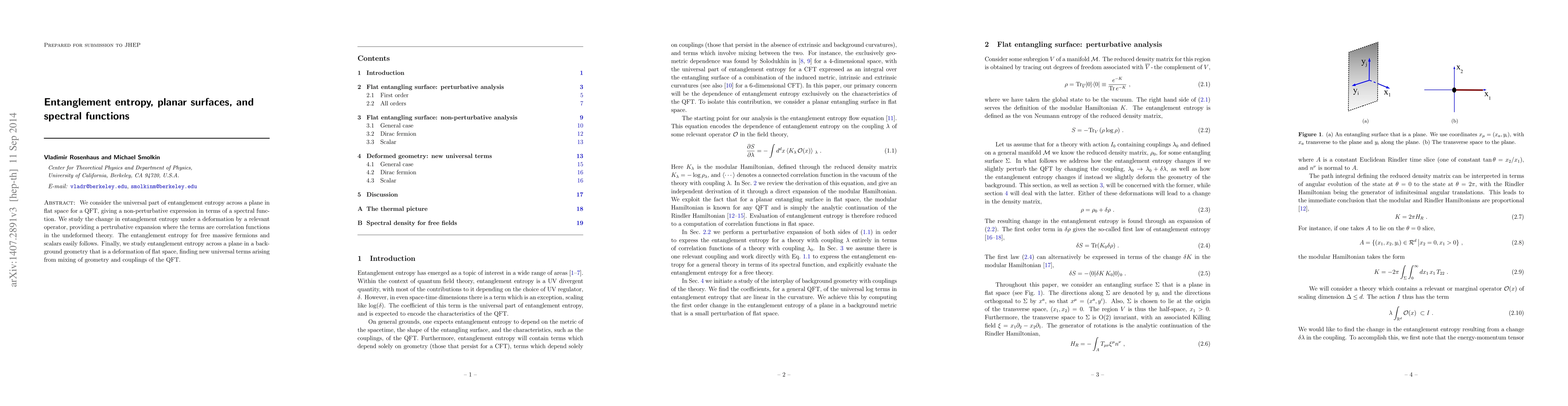 We consider the universal part of entanglement entropy across a plane in flat space for a QFT, giving a non-perturbative expression in terms of a spectral function. We study the change in entanglement entropy under a deformation by a relevant operator, providing a pertrubative expansion where the terms are correlation functions in the undeformed theory. The entanglement entropy for free massive fermions and scalars easily follows. Finally, we study entanglement entropy across a plane in a background geometry that is a deformation of flat space, finding new universal terms arising from mixing of geometry and couplings of the QFT.