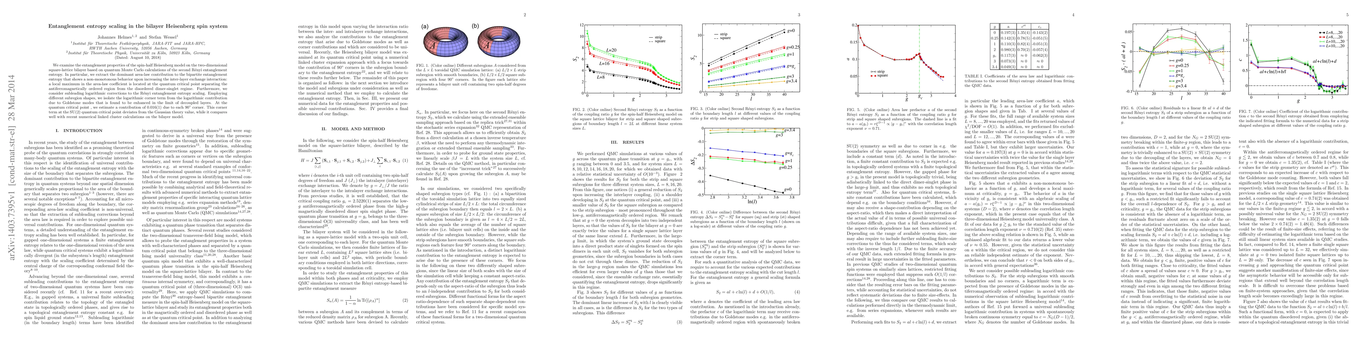 We examine the entanglement properties of the spin-half Heisenberg model on the two-dimensional square-lattice bilayer based on quantum Monte Carlo calculations of the second R\'enyi entanglement entropy. In particular, we extract the dominant area-law contribution to the bipartite entanglement entropy that shows a non-monotonous behavior upon increasing the inter-layer exchange interaction: a local maximum in the area-law coefficient is located at the quantum critical point separating the antiferromagnetically ordered region from the disordered dimer-singlet regime. Furthermore, we consider subleading logarithmic corrections to the R\'enyi entanglement entropy scaling. Employing different subregion shapes, we isolate the logarithmic corner term from the logarithmic contribution due to Goldstone modes that is found to be enhanced in the limit of decoupled layers. At the quantum critical point, we estimate a contribution of $0.016(1)$ due to each $90^{\circ}$ corner. This corner term at the SU(2) quantum critical point deviates from the Gaussian theory value, while it compares well with recent numerical linked cluster calculations on the bilayer model.