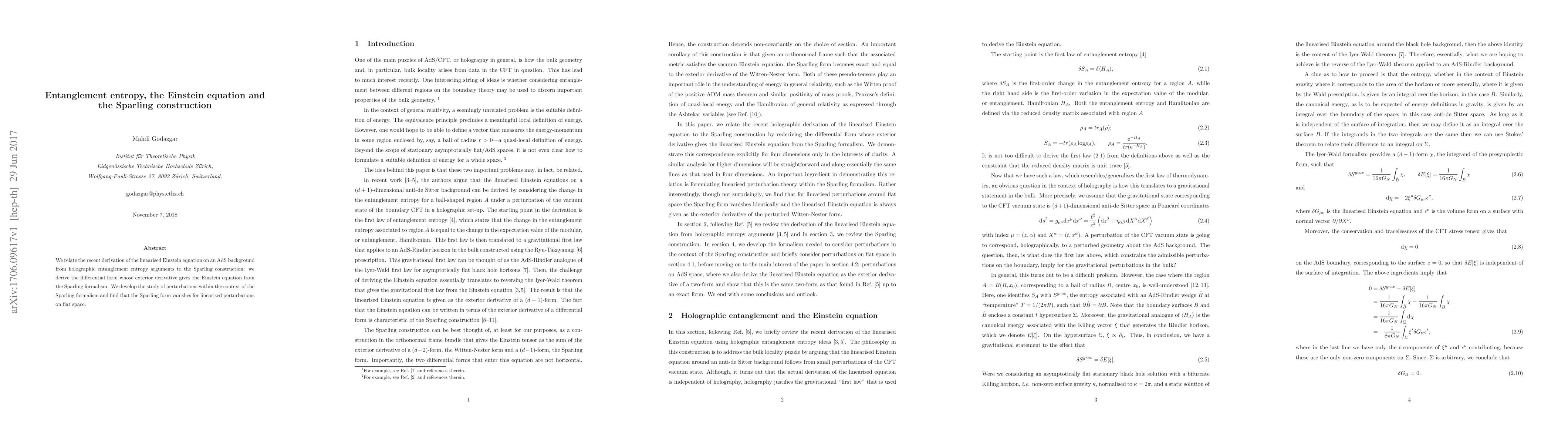 We relate the recent derivation of the linearised Einstein equation on an AdS background from holographic entanglement entropy arguments to the Sparling construction: we derive the differential form whose exterior derivative gives the Einstein equation from the Sparling formalism. We develop the study of perturbations within the context of the Sparling formalism and find that the Sparling form vanishes for linearised perturbations on flat space.