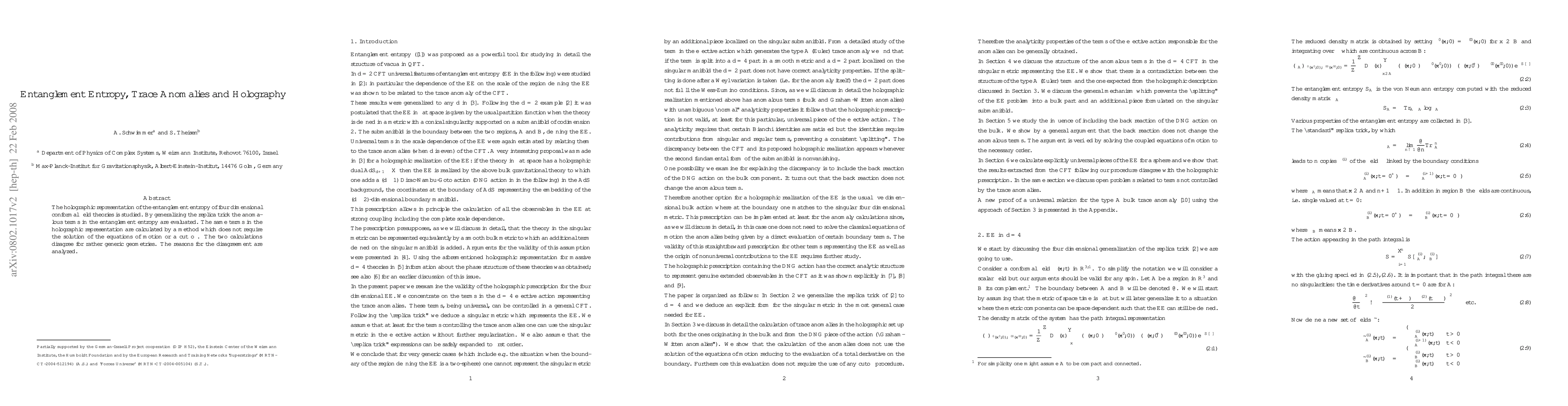 The holographic representation of the entanglement entropy of four dimensional conformal field theories is studied. By generalizing the replica trick the anomalous terms in the entanglement entropy are evaluated. The same terms in the holographic representation are calculated by a method which does not require the solution of the equations of motion or a cut off. The two calculations disagree for rather generic geometries. The reasons for the disagreement are analyzed.