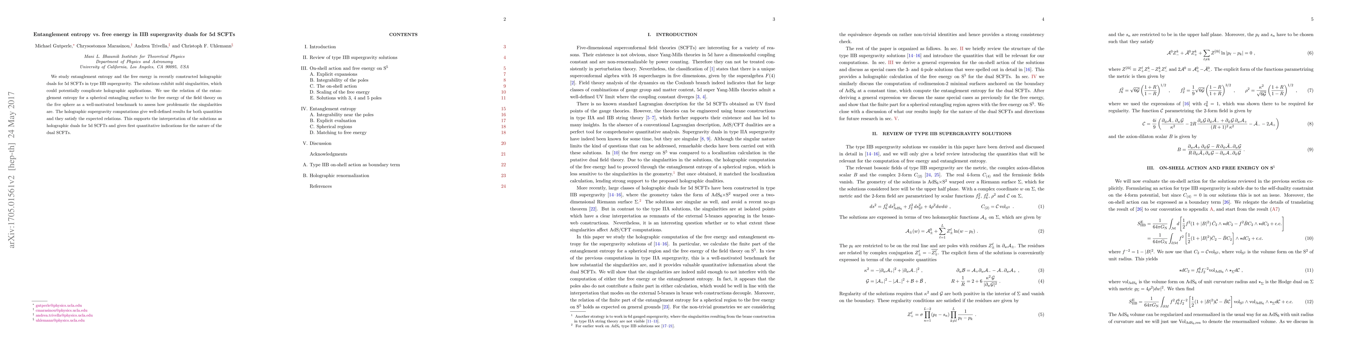 This paper investigates entanglement entropy and free energy in holographic duals for 5d Superconformal Field Theories (SCFTs) in type IIB supergravity, revealing mild singularities. It assesses the impact of these singularities by relating entanglement entropy on a spherical surface to the free energy on a five-sphere, finding well-defined results that support the interpretation of the solutions as valid holographic duals and provide initial insights into the nature of the dual SCFTs.