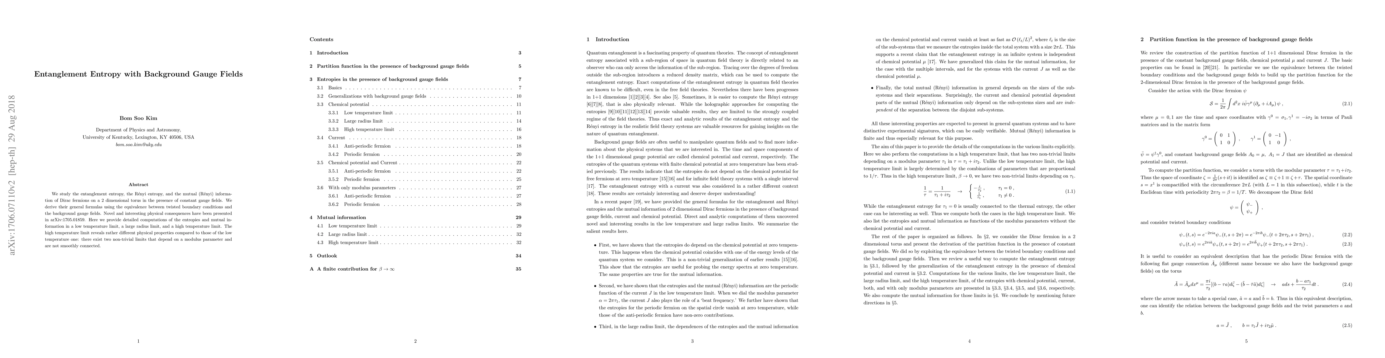 We study the entanglement entropy, the R\'enyi entropy, and the mutual (R\'enyi) information of Dirac fermions on a 2 dimensional torus in the presence of constant gauge fields. We derive their general formulas using the equivalence between twisted boundary conditions and the background gauge fields. Novel and interesting physical consequences have been presented in arXiv:1705.01859. Here we provide detailed computations of the entropies and mutual information in a low temperature limit, a large radius limit, and a high temperature limit. The high temperature limit reveals rather different physical properties compared to those of the low temperature one: there exist two non-trivial limits that depend on a modulus parameter and are not smoothly connected.