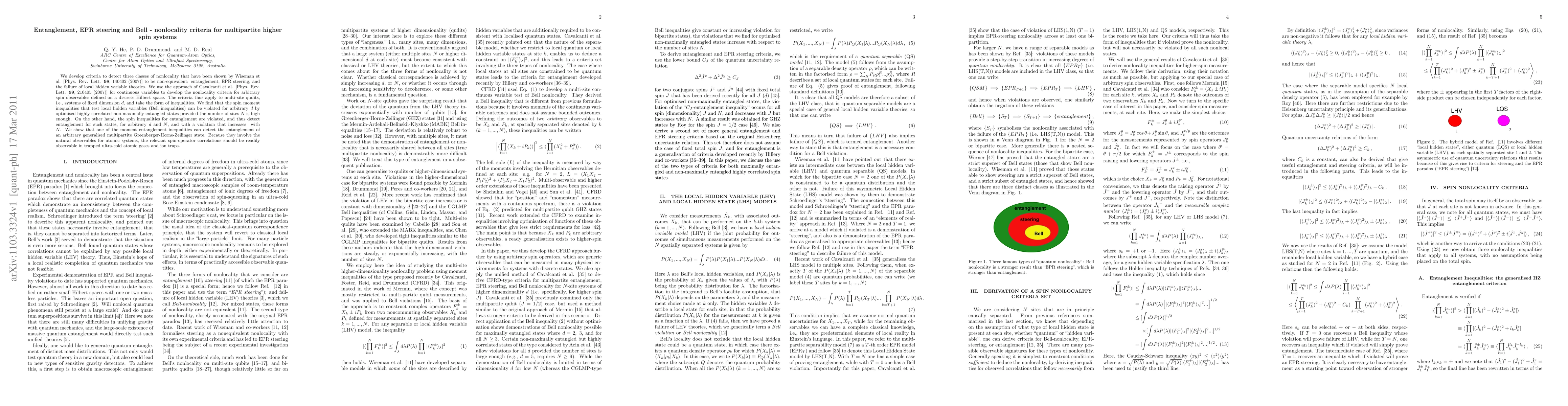 We develop criteria to detect three classes of nonlocality that have been shown by Wiseman et al. [Phys. Rev. Lett. 98, 140402 (2007)] to be nonequivalent: entanglement, EPR steering, and the failure of local hidden-variable theories. We use the approach of Cavalcanti et al. [Phys. Rev. Lett. 99, 210405 (2007)] for continuous variables to develop the nonlocality criteria for arbitrary spin observables defined on a discrete Hilbert space. The criteria thus apply to multisite qudits, i.e., systems of fixed dimension d, and take the form of inequalities. We find that the spin moment inequalities that test local hidden variables (Bell inequalities) can be violated for arbitrary d by optimized highly correlated nonmaximally entangled states provided the number of sites N is high enough. On the other hand, the spin inequalities for entanglement are violated and thus detect entanglement for such states, for arbitrary d and N, and with a violation that increases with N.We show that one of the moment entanglement inequalities can detect the entanglement of an arbitrary generalized multipartite Greenberger-Horne-Zeilinger state. Because they involve the natural observables for atomic systems, the relevant spin-operator correlations should be readily observable in trapped ultracold atomic gases and ion traps.