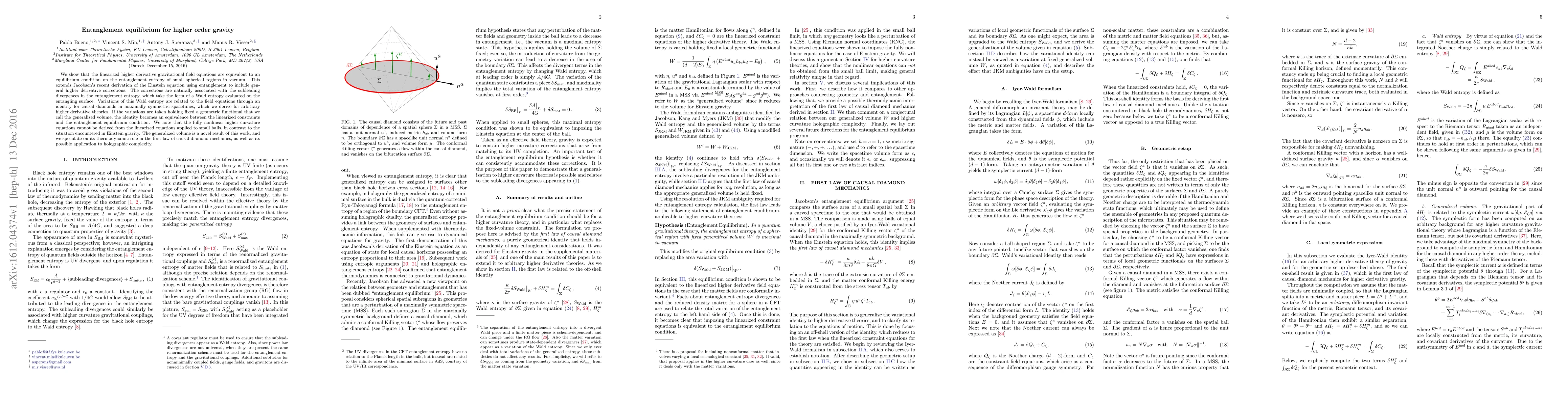 We show that the linearized higher derivative gravitational field equations are equivalent to an equilibrium condition on the entanglement entropy of small spherical regions in vacuum. This extends Jacobson's recent derivation of the Einstein equation using entanglement to include general higher derivative corrections. The corrections are naturally associated with the subleading divergences in the entanglement entropy, which take the form of a Wald entropy evaluated on the entangling surface. Variations of this Wald entropy are related to the field equations through an identity for causal diamonds in maximally symmetric spacetimes, which we derive for arbitrary higher derivative theories. If the variations are taken holding fixed a geometric functional that we call the generalized volume, the identity becomes an equivalence between the linearized constraints and the entanglement equilibrium condition. We note that the fully nonlinear higher curvature equations cannot be derived from the linearized equations applied to small balls, in contrast to the situation encountered in Einstein gravity. The generalized volume is a novel result of this work, and we speculate on its thermodynamic role in the first law of causal diamond mechanics, as well as its possible application to holographic complexity.