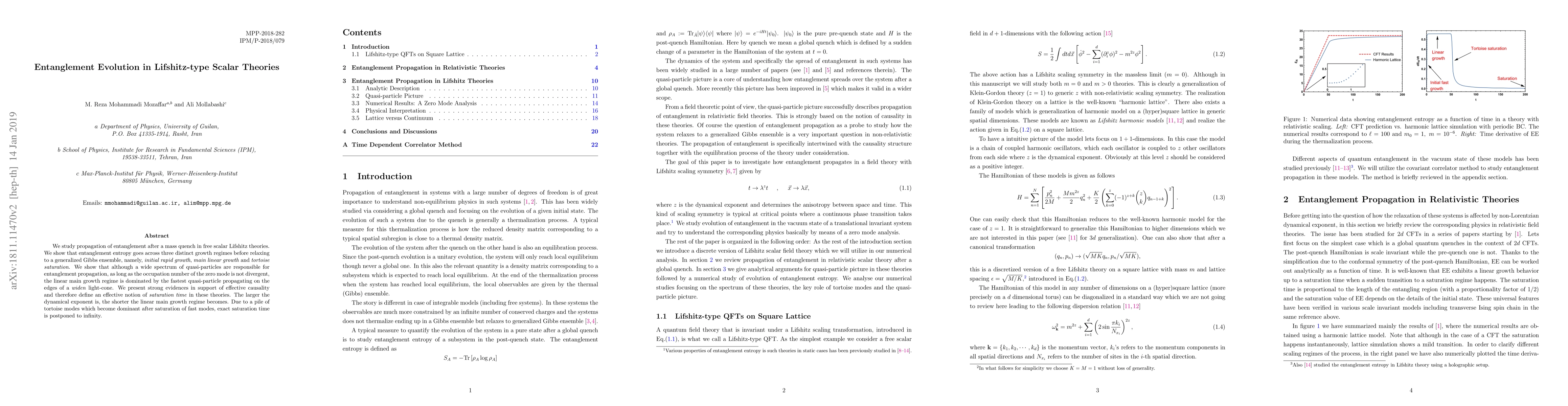This paper investigates the evolution of entanglement entropy in free scalar Lifshitz theories following a mass quench, revealing three distinct growth regimes: initial rapid growth, main linear growth, and tortoise saturation. The study finds that the main linear growth is dominated by the fastest quasi-particles, supporting effective causality and defining an effective saturation time, which shortens with larger dynamical exponents.