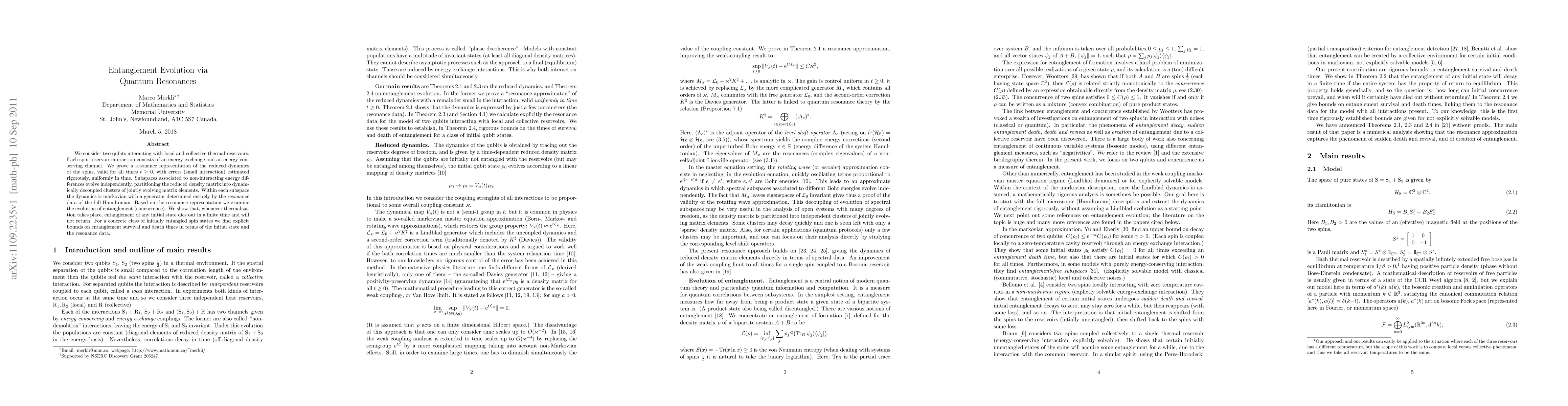 We consider two qubits interacting with local and collective thermal reservoirs. Each spin-reservoir interaction consists of an energy exchange and an energy conserving channel. We prove a resonance representation of the reduced dynamics of the spins, valid for all times t>=0, with errors (small interaction) estimated rigorously, uniformly in time. Subspaces associated to non-interacting energy differences evolve independently, partitioning the reduced density matrix into dynamically decoupled clusters of jointly evolving matrix elements. Within each subspace the dynamics is markovian with a generator determined entirely by the resonance data of the full Hamiltonian. Based on the resonance representation we examine the evolution of entanglement (concurrence). We show that, whenever thermalization takes place, entanglement of any initial state dies out in a finite time and will not return. For a concrete class of initially entangled spin states we find explicit bounds on entanglement survival and death times in terms of the initial state and the resonance data.