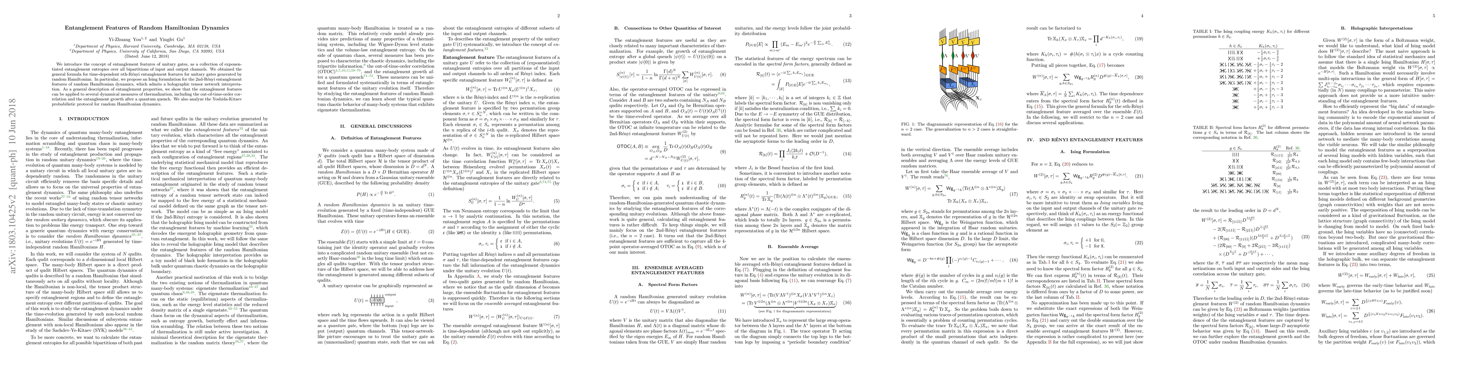 We introduce the concept of entanglement features of unitary gates, as a collection of exponentiated entanglement entropies over all bipartitions of input and output channels. We obtained the general formula for time-dependent $n$th-Renyi entanglement features for unitary gates generated by random Hamiltonian. In particular, we propose an Ising formulation for the 2nd-Renyi entanglement features of random Hamiltonian dynamics, which admits a holographic tensor network interpretation. As a general description of entanglement properties, we show that the entanglement features can be applied to several dynamical measures of thermalization, including the out-of-time-order correlation and the entanglement growth after a quantum quench. We also analyze the Yoshida-Kitaev probabilistic protocol for random Hamiltonian dynamics.