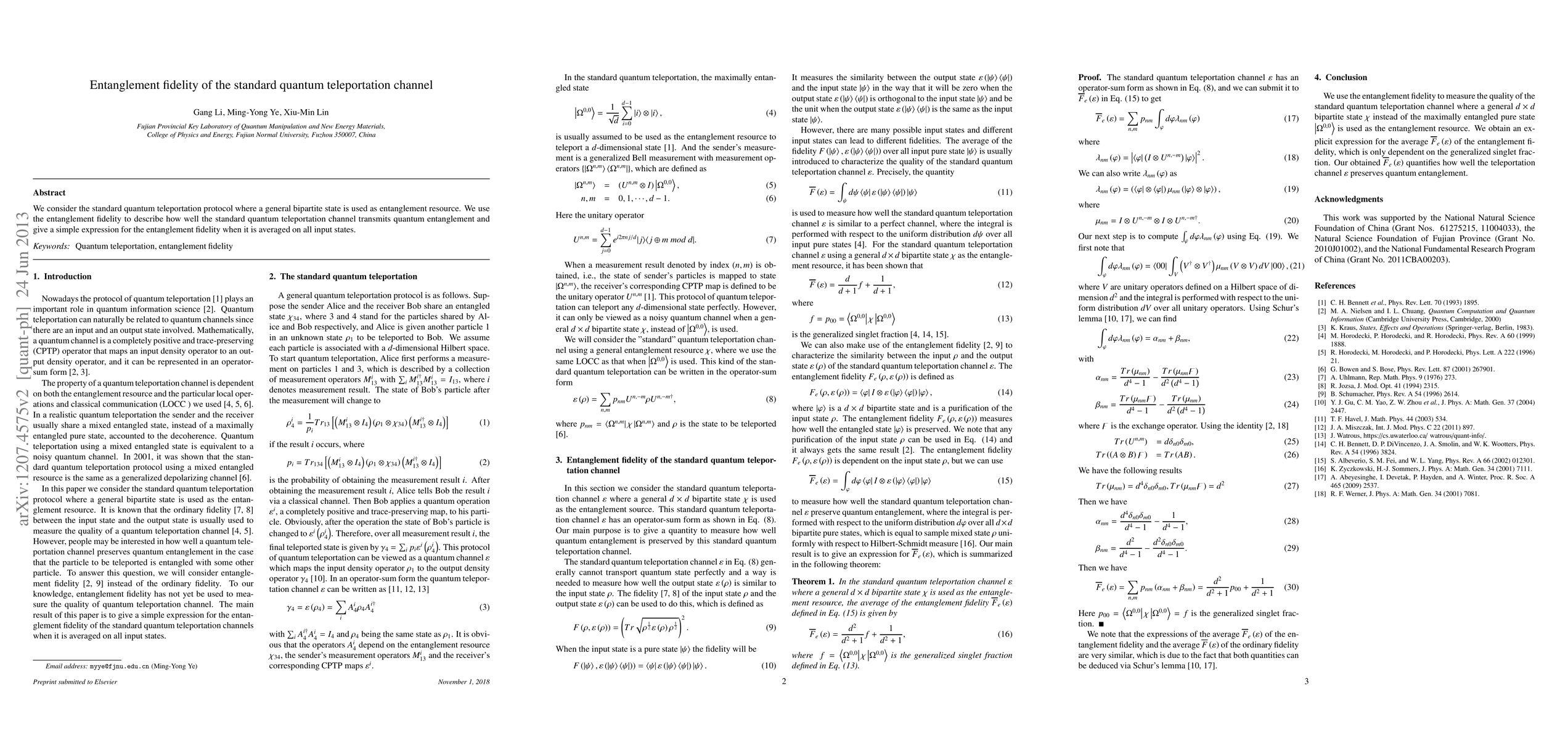 We consider the standard quantum teleportation protocol where a general bipartite state is used as entanglement resource. We use the entanglement fidelity to describe how well the standard quantum teleportation channel transmits quantum entanglement and give a simple expression for the entanglement fidelity when it is averaged on all input states.